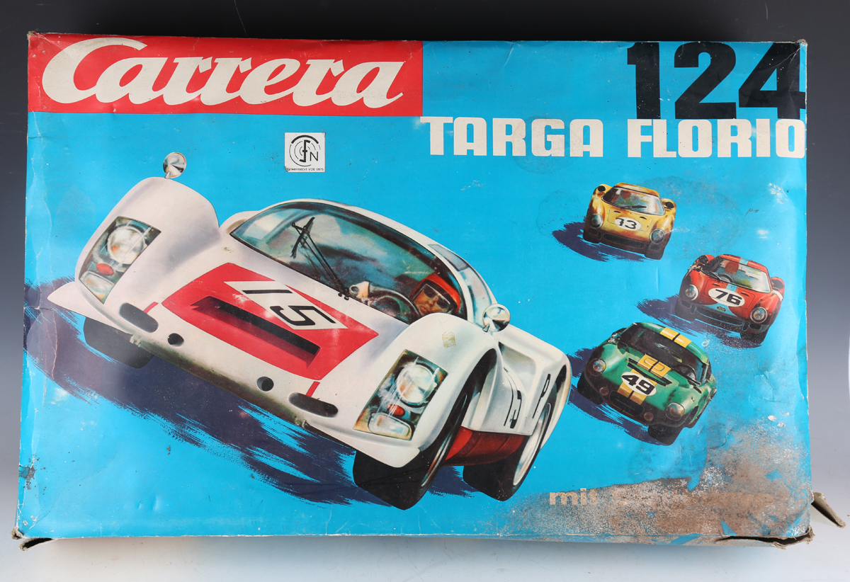 A Carrera 124 Targa Florio slot car racing set, together with two Formula 1 type racing cars, track and accessories, mostly boxed (playwear, unchecked).