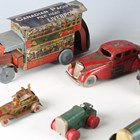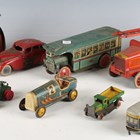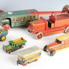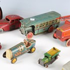 A group of tinplate toys, including Burnett Ubilda fire engine, Smith & Casey bus, double-decker bus, German racing car, German clockwork armoured car and Minic caterpillar tractor (playwear and faults), together with a diecast metal Silver Arrow saloon car (overpainting and rust spots).