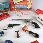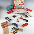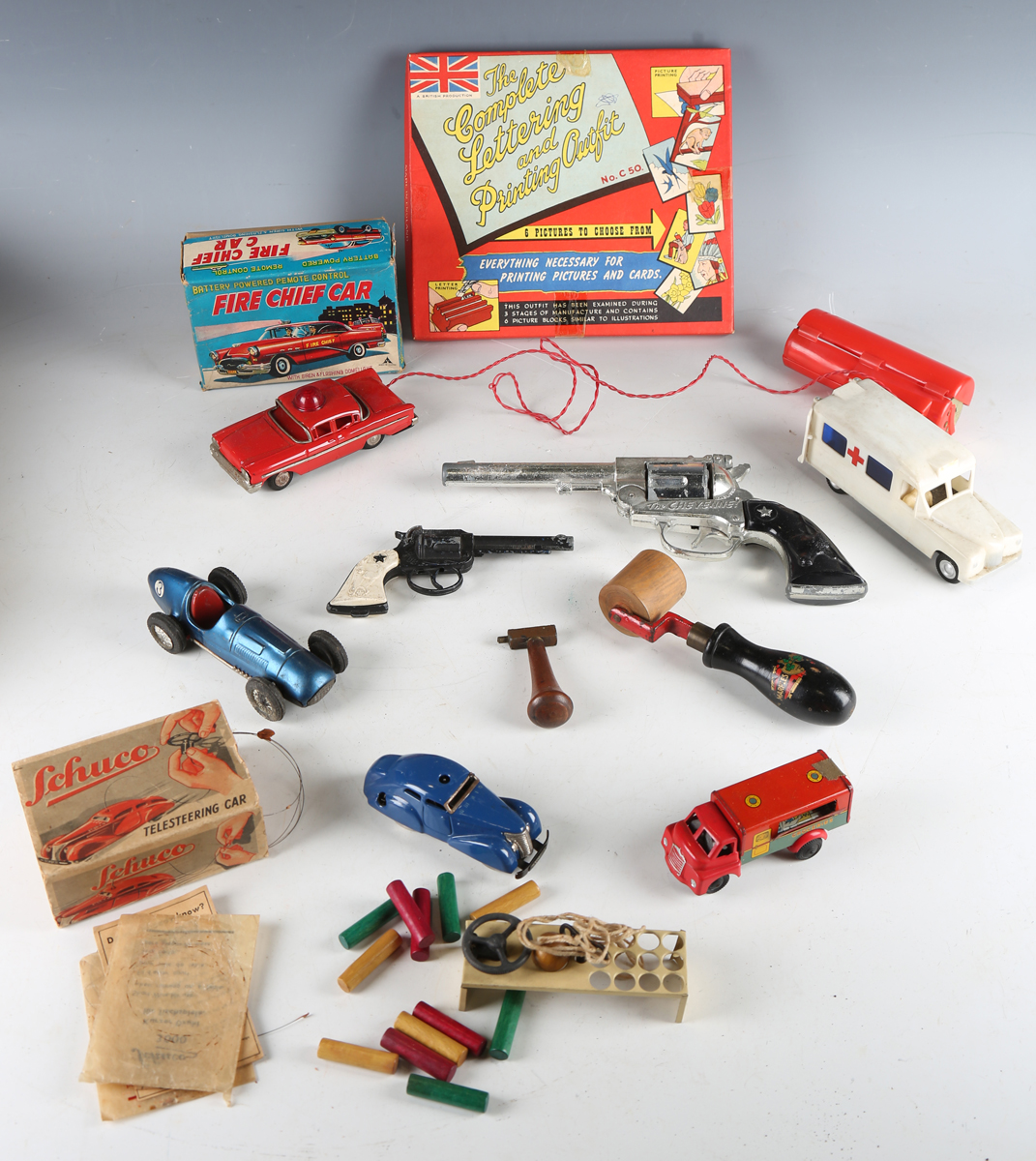 A Schuco 3000 Telesteering Car, boxed, a Japanese tinplate battery-powered Fire Chief Car, boxed, a Mak’s plastic friction-powered ambulance, a Wells Brimtoy groceries van, a Scalex tinplate racing car, a printing set and two toy guns (playwear).