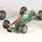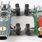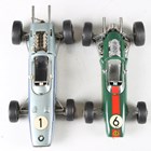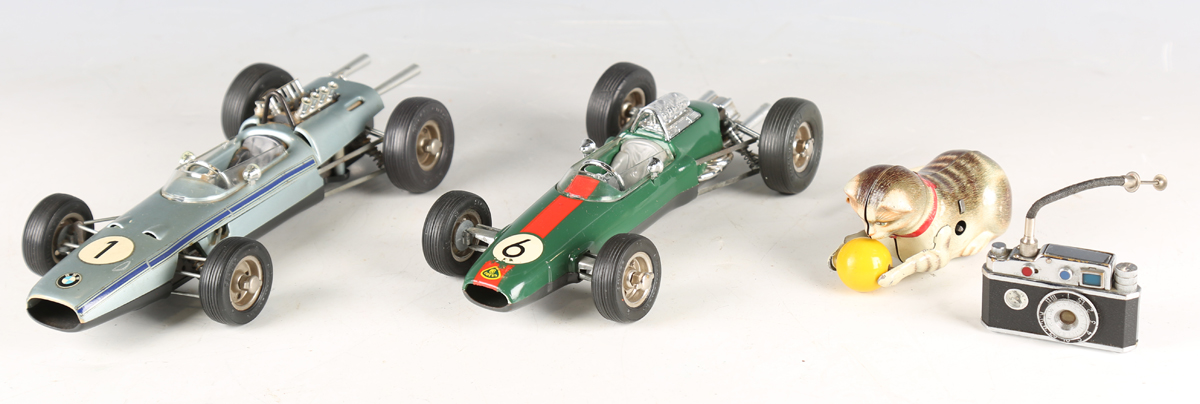 Two Schuco clockwork model racing cars, comprising No. 1071 Lotus Formula 1 and No. 1072 BMW Formula 2, with keys and tools, together with a German tinplate clockwork cat playing with a ball, and a table lighter in the form of a camera (some playwear and faults).