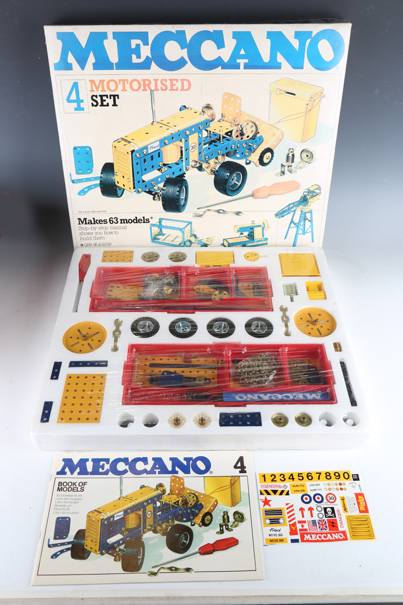 A Meccano No. 4 Motorised set, together with a Meccano No. 8951 Tuning Radio Control car, a No. 4700 Design building set, a Merkur biplane building set and two Vogue building sets, all boxed (unchecked).