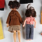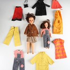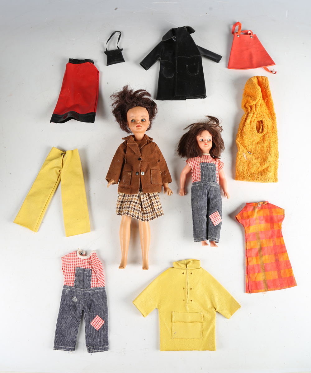 A Sindy doll wearing a brown coat and skirt, together with a Sindy patch doll and a group of dolls' clothes.