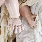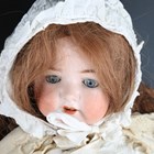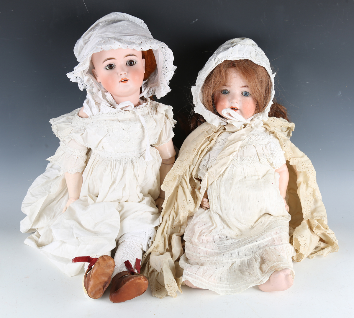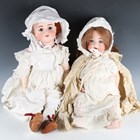A Heubach Köppelsdorf socket bisque head doll, impressed '320.8', with later auburn wig, sleeping blue eyes, open mouth and bent limb composition body, height 59cm, together with a German bisque socket head doll, impressed 'AWW', with sleeping brown eyes, open mouth, pierced ears and jointed composition body, height 69cm, both clothed (some damage to fingers and overpainting to the bodies).