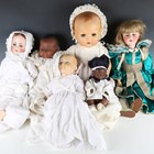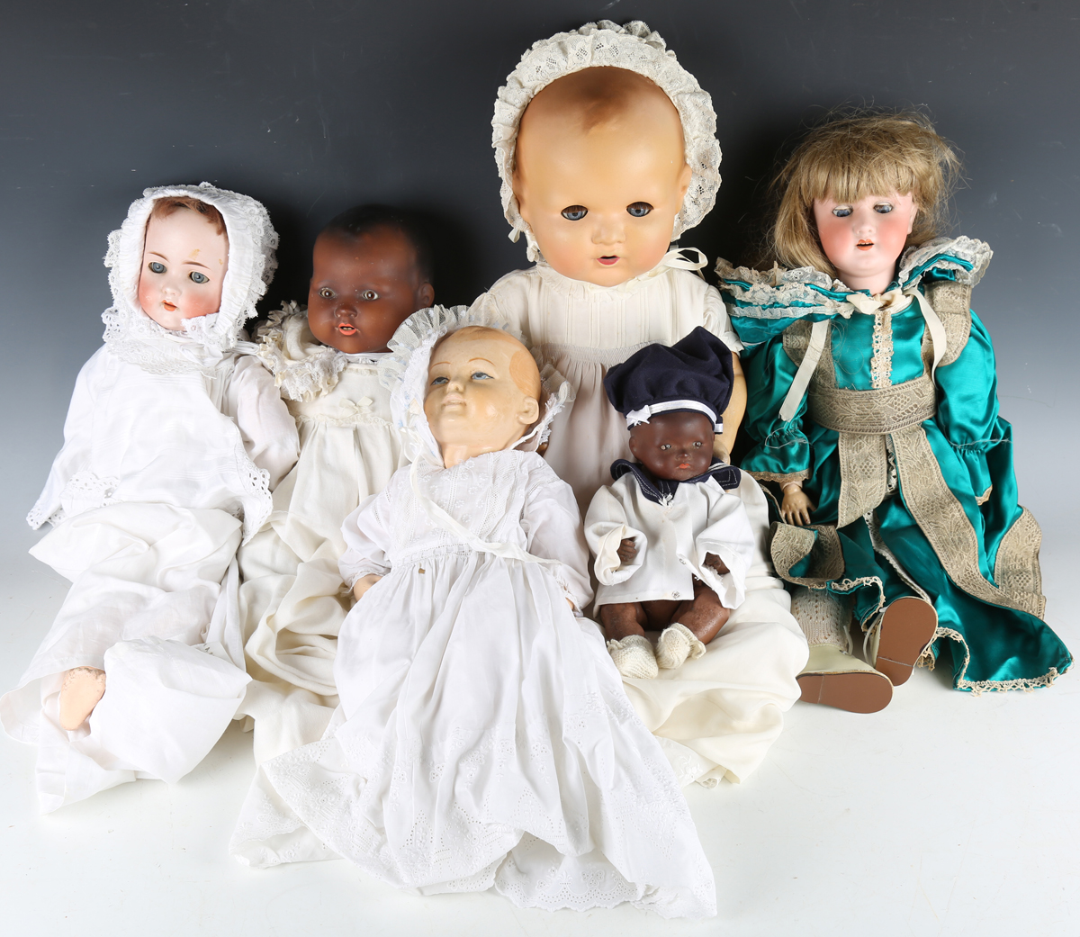 Four German socket head dolls, comprising a Bruno Schmidt bisque head doll, impressed '9', height 55cm, a Heubach Köppelsdorf bisque head doll, impressed '250.3', height 59cm, and two Armand Marseille black baby dolls, heights 44cm and 28cm, together with an AM composition baby doll, height 65cm, and a composition baby doll with painted features, height 42cm.