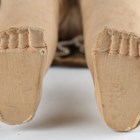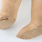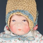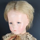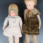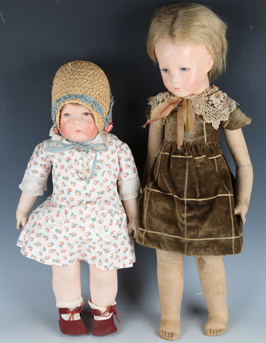 A Kathe Kruse cloth girl doll, the moulded head with painted brown hair and features, the body with jointed shoulders and hips, stitched fingers and separate thumb, the left foot signed and numbered '76786', height 42cm, together with a similar doll with blonde hair, the foot indistinctly numbered (faded), height 52cm.