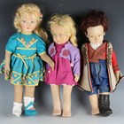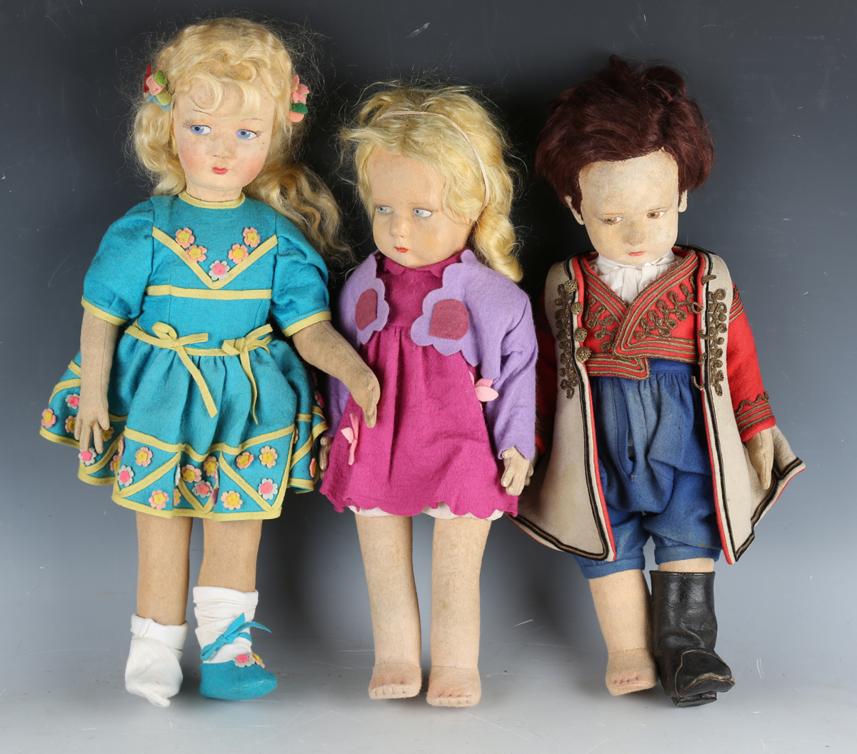 Three Lenci felt dolls, comprising two girl dolls with blonde hair and painted features, heights 42cm and 48cm, and a boy doll with brown hair and painted features, the right foot signed, height 43cm, wearing an Eastern European costume.