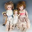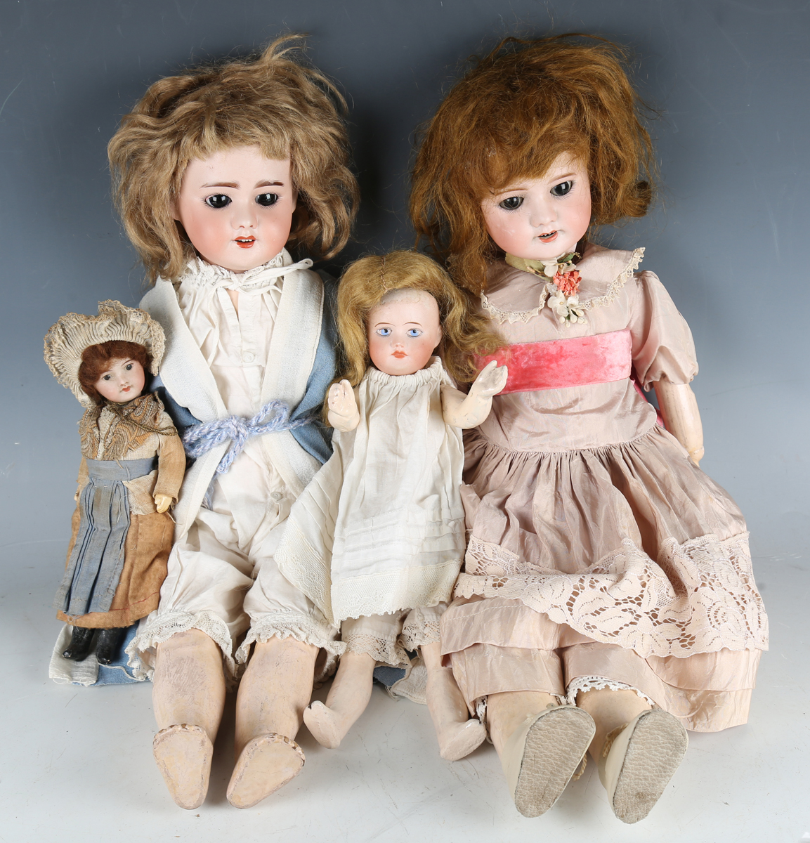 Four SFBJ bisque socket head dolls, comprising two impressed '60 3', with later wigs, sleeping brown glass eyes, open mouths showing upper teeth and jointed composition bodies, height 51cm, the third impressed '60 10/0', with blonde wig, painted features and composition body, height 32cm (damage to fingers), and the fourth impressed '60 13/0', with composition body, height 21cm.