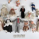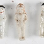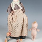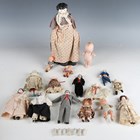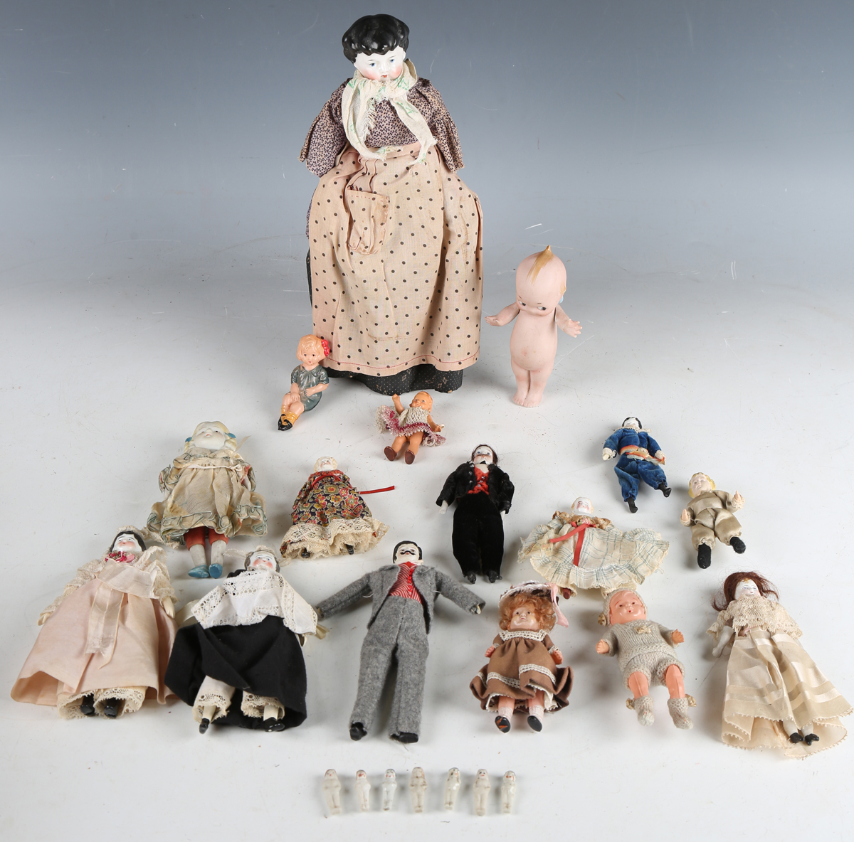 A German porcelain head and shoulders doll with painted features, fabric body and porcelain lower limbs, height 30cm, together with nine other porcelain head dolls, a Japanese bisque head and shoulders doll, height 14.5cm, an all-bisque boy doll, a Kewpie doll, seven Frozen Charlotte dolls and three plastic dolls.