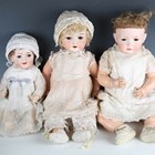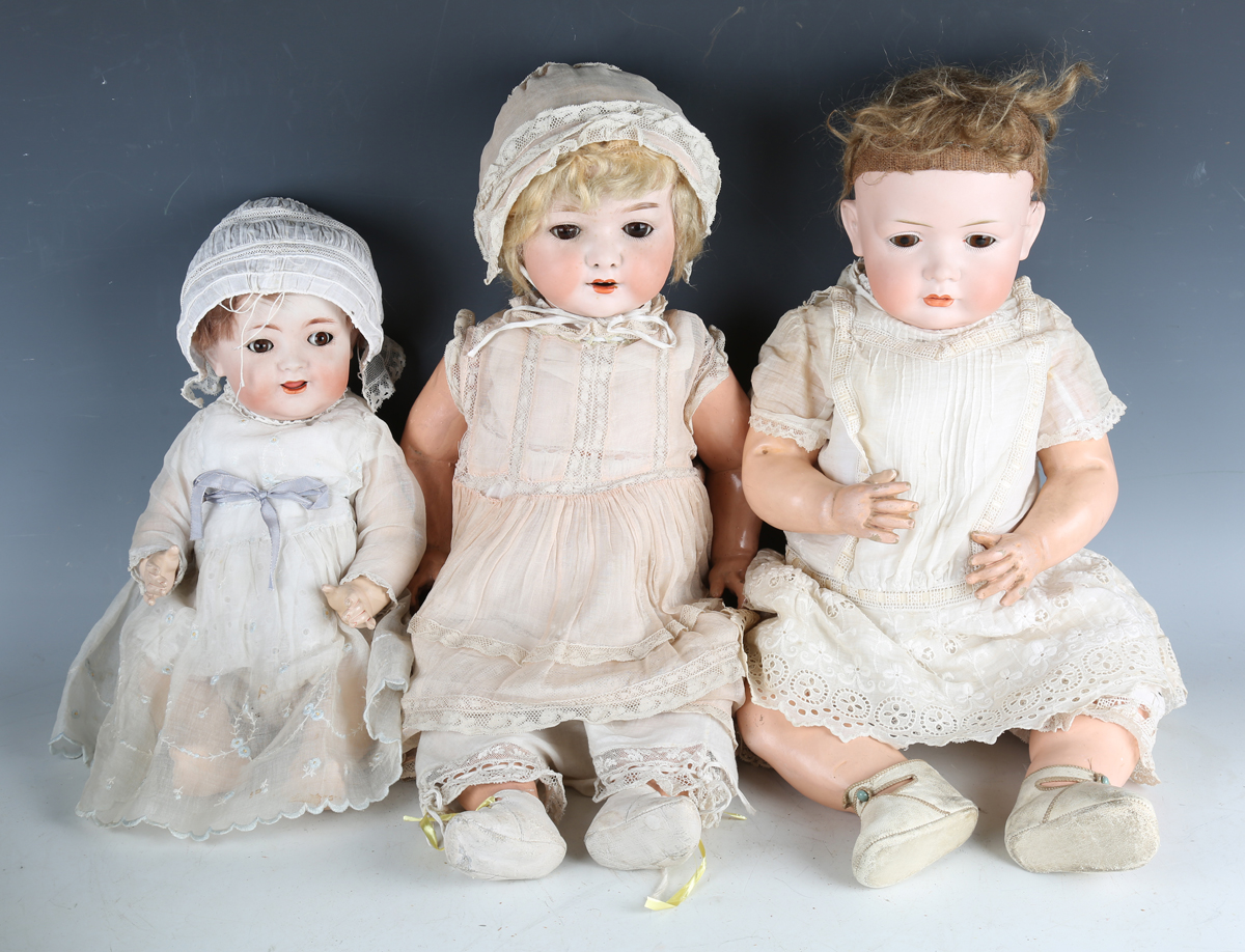 Three bisque socket head dolls, comprising Heubach Köppelsdorf, impressed '320.6', with blonde wig, sleeping brown eyes and open mouth, height 52cm, Simon & Halbig, impressed '126 36', with brown wig, flirty brown eyes and open mouth, height 40cm, and Bahr Proschild, impressed '604 12', with brown wig, sleeping brown eyes, open mouth and bent limb composition body, height 54cm, all clothed.