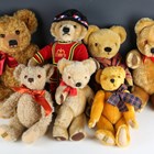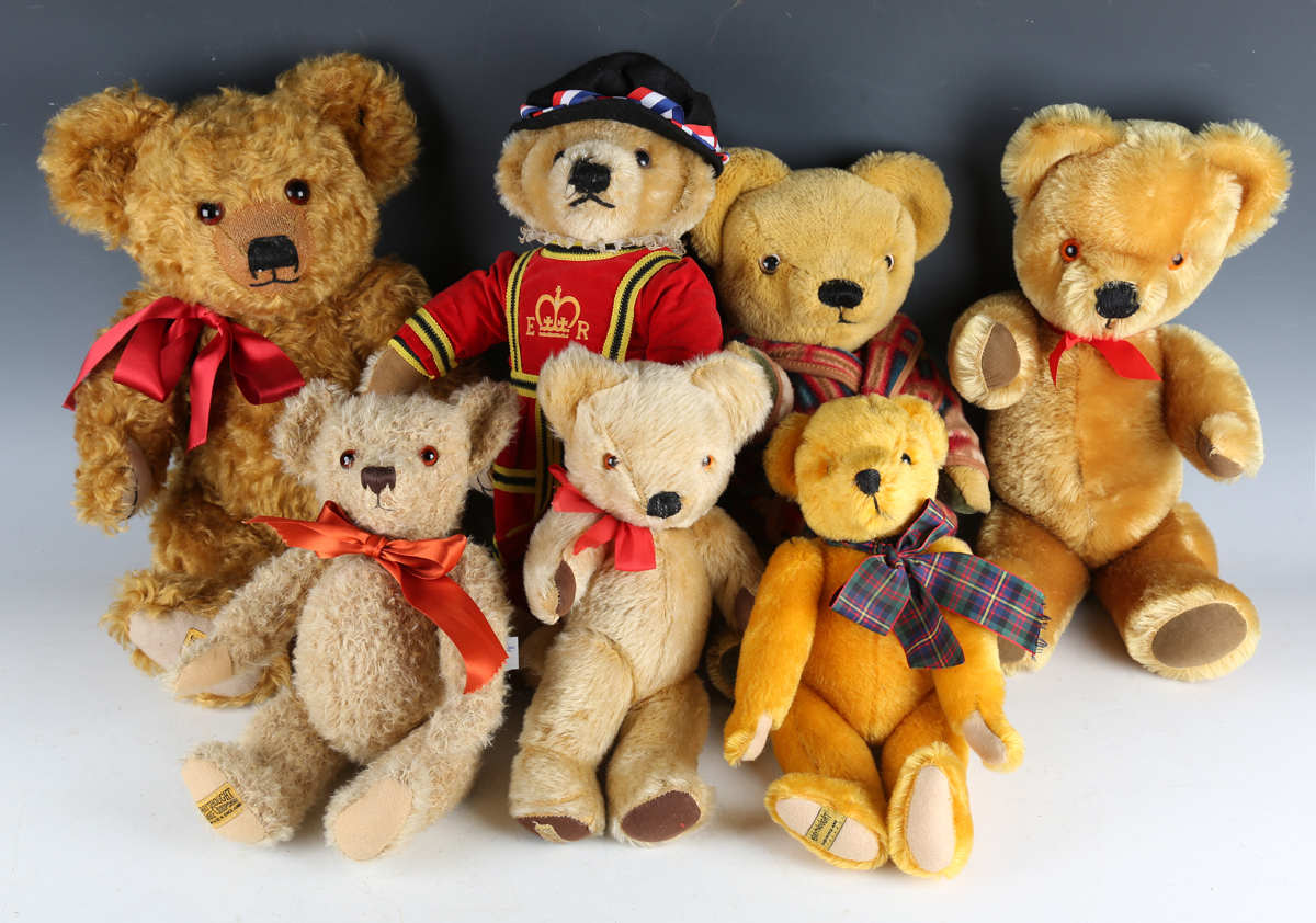 A group of Merrythought teddy bears, comprising limited edition Bruin commemorative bear, 133/200, boxed, Beefeater bear and five others.