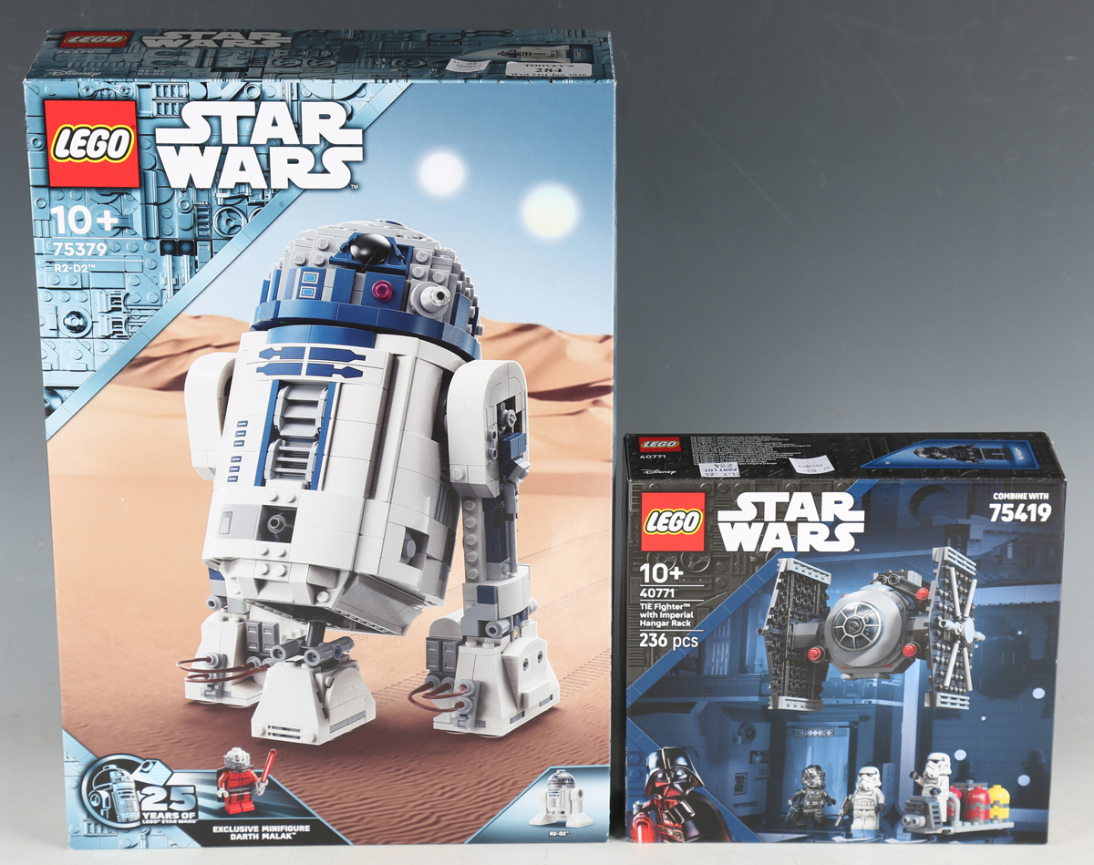 A Lego Star Wars No. 75372 R2-D2 and a No. 40771 TIE fighter, both within unopened boxes.