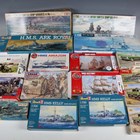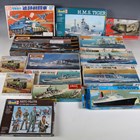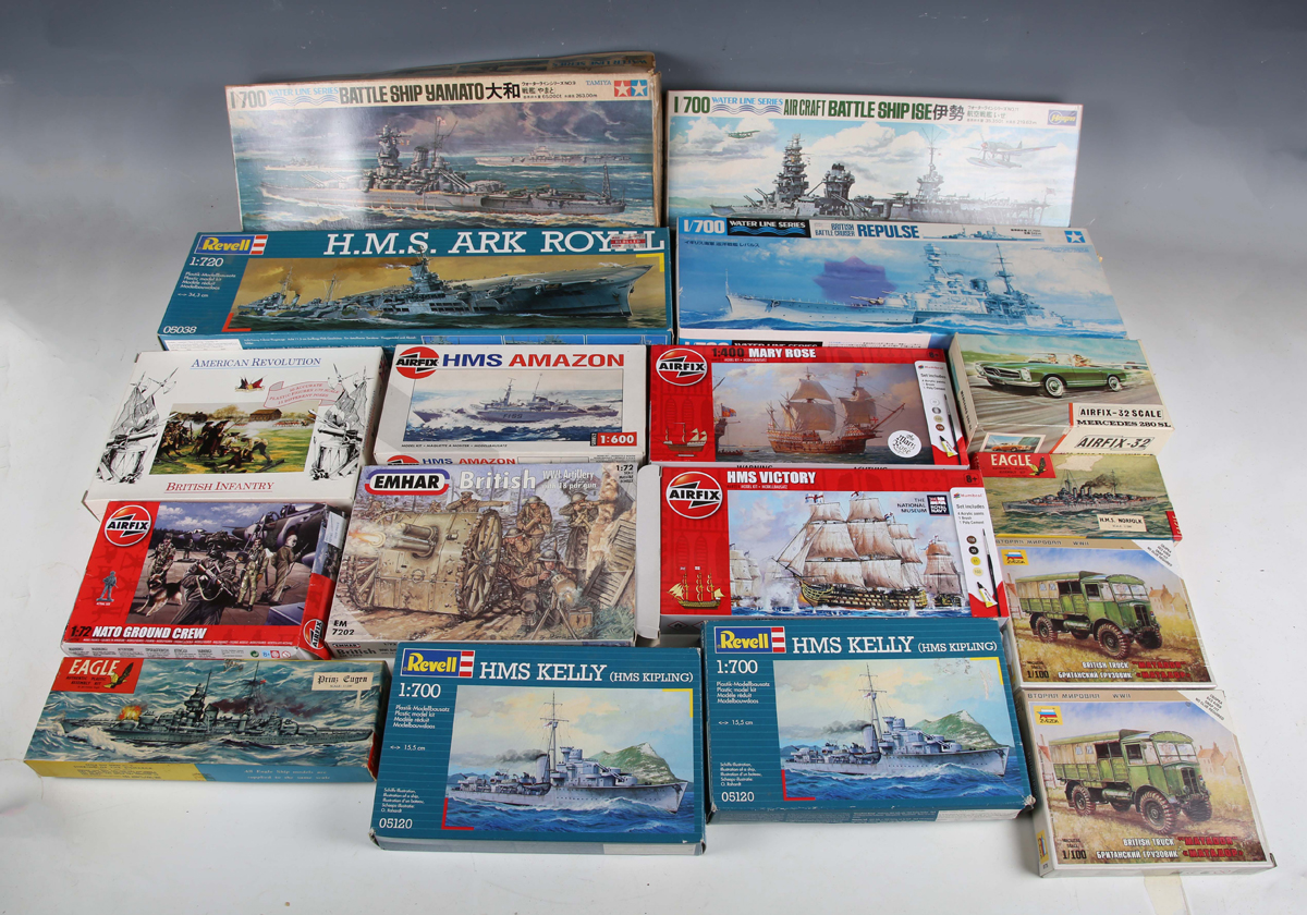 A collection of plastic model kits, including Imai Spectrum Pursuit Vehicle, Tamiya battleship Yamoto, Hasagawa aircraft battleship Ise, Airfix Mercedes 280 SL and Revell HMS Ark Royal, all boxed (unchecked).