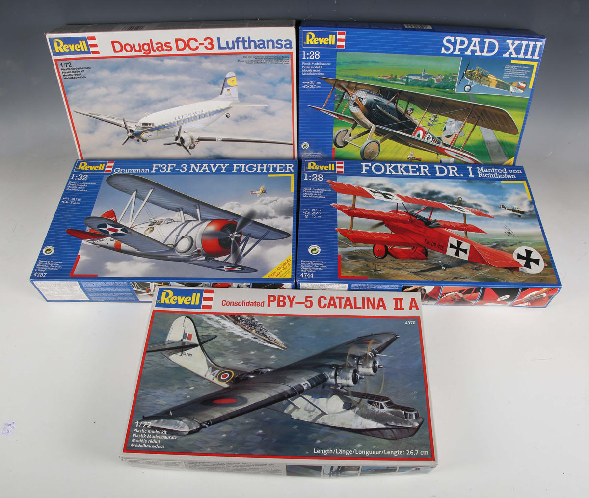 Ten Revell 1:72, 1:28 and 1:32 scale plastic model aircraft kits, including Douglas DC-3 ‘Lufthansa’, Fokker DR.1 and Consolidated PBY-5 Catalina II A, all boxed (unchecked).