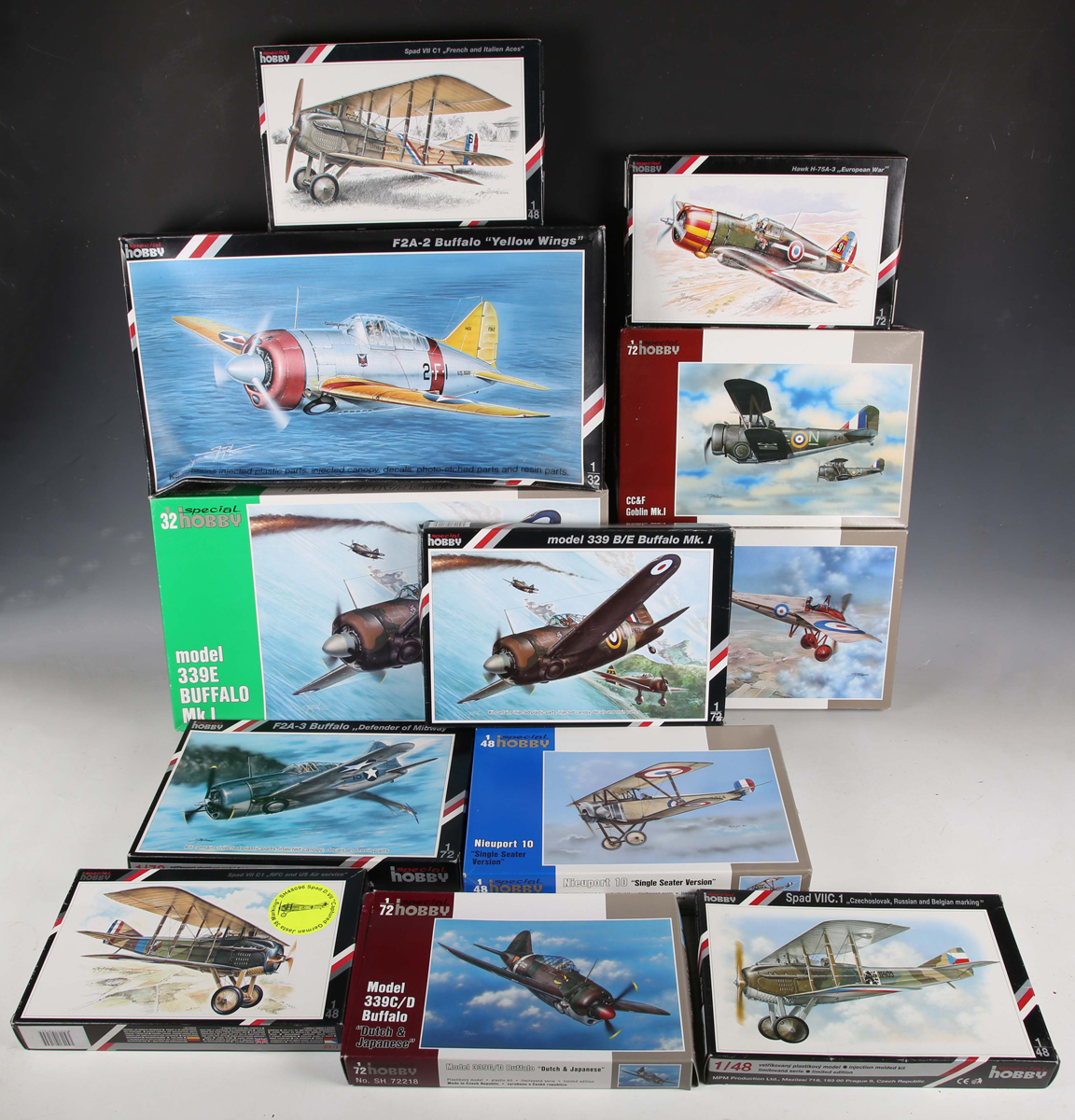 Twelve Special Hobby 1:32 and 1:72 scale plastic model aircraft kits, including Buffalo Mk.I, Nieuport 10 'Single Seater Version' and F2A-3 Buffalo ‘Defender of Midway’, all boxed (unchecked).