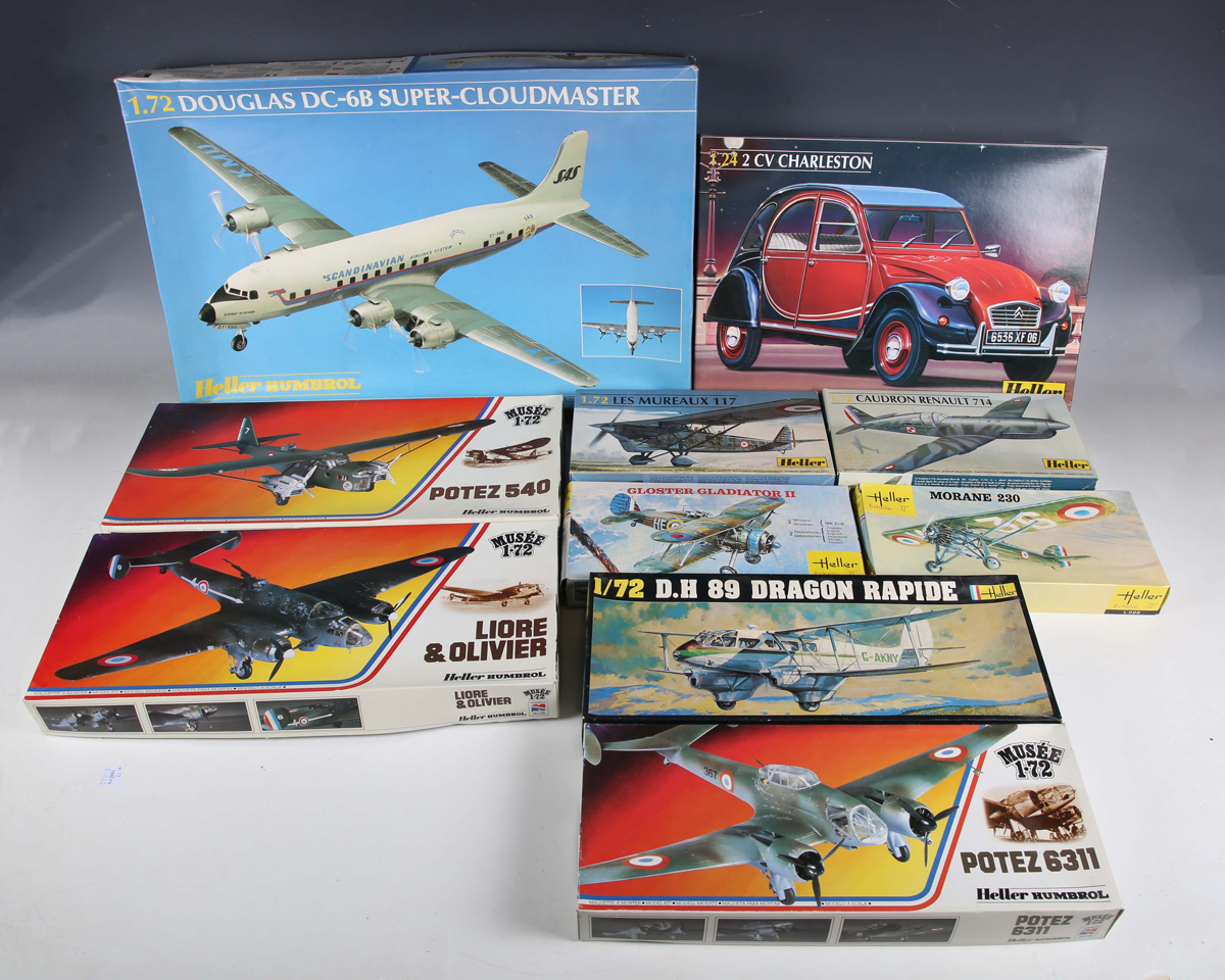 Twenty Heller and Heller Humbrol 1:72 scale plastic model aircraft kits, including Morane Saulnier MS 225, D.H 89 Dragon Rapide and Curtiss SBC.4 Helldiver Cleveland 1, together with a Heller 1:24 scale plastic model Citroën 2CV kit, all boxed (unchecked).