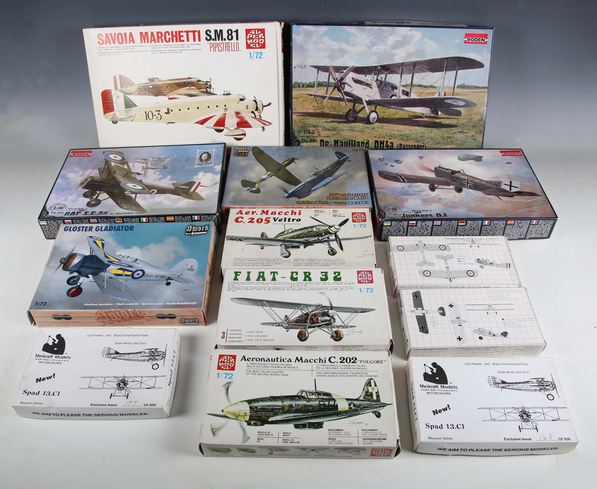 Forty 1:48 and 1:72 scale plastic model aircraft kits, including Dragon Sword and Super Model, all boxed (unchecked).