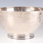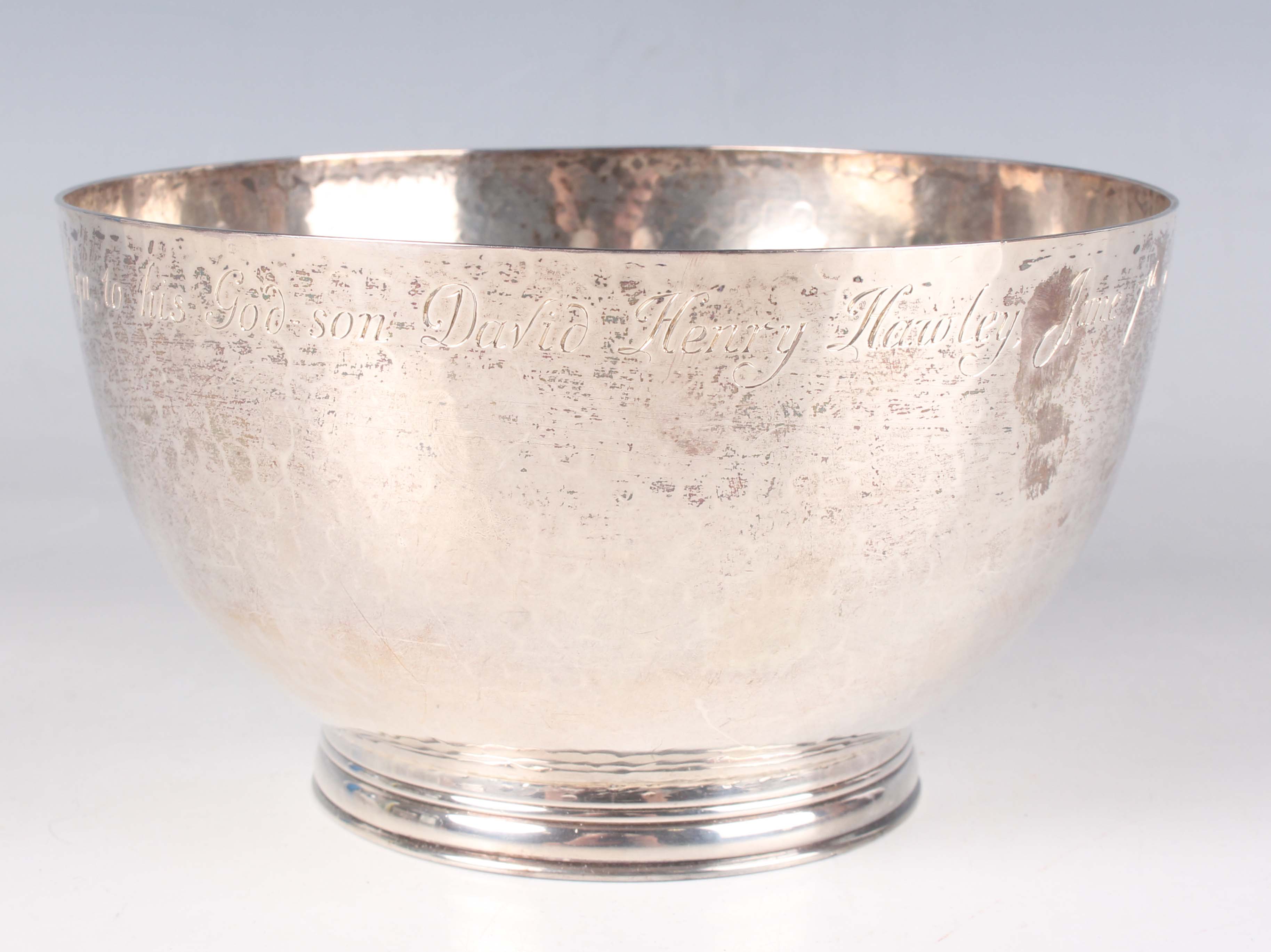 A George V silver circular bowl with martelé decoration, the rim inscription engraved, on a circular foot, London 1913 by Harold Child, detailed 'Child & Child' to base, weight 273.8g, height 7.8cm, diameter 14cm.