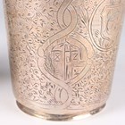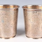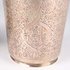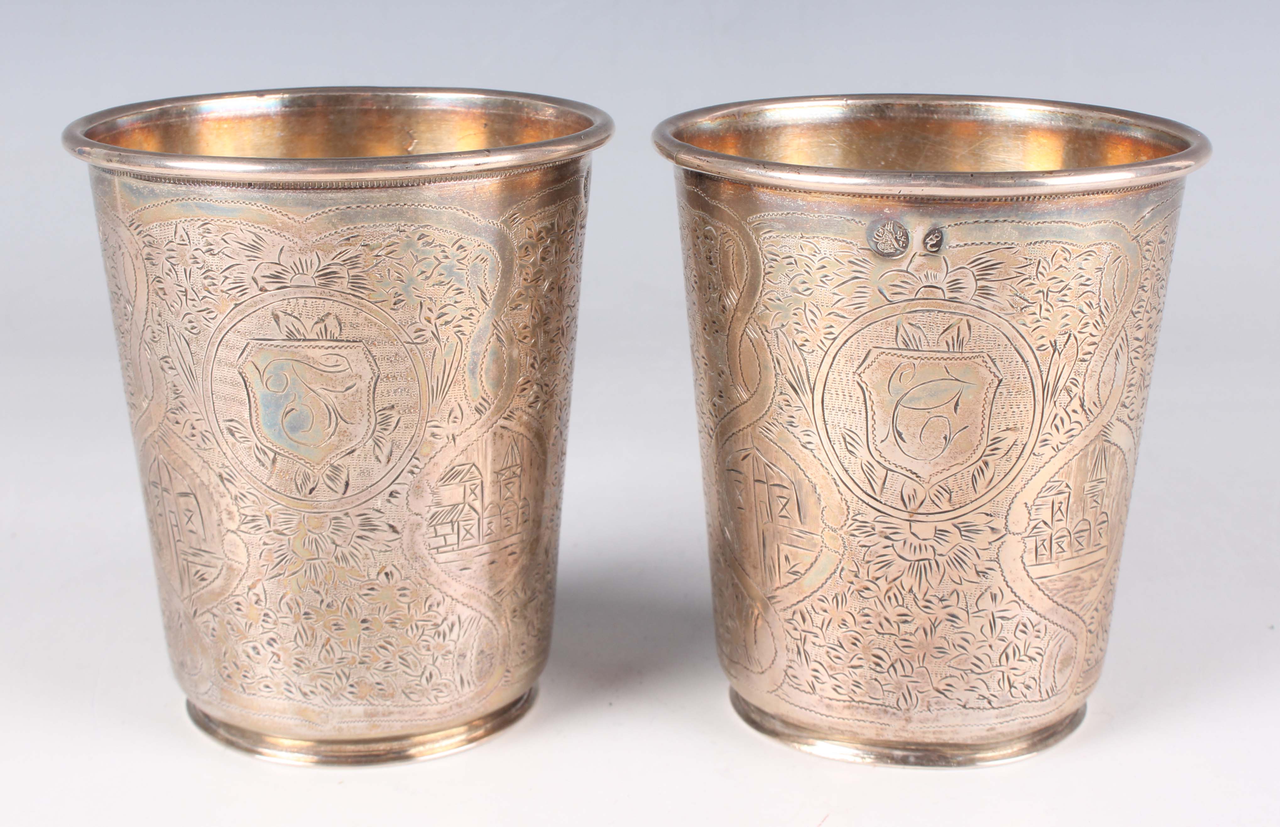 A pair of Turkish silver tapering cylindrical beakers, each engraved with vignettes of buildings against a foliate ground, tughra and standard marks to sides, total weight 187.3g, height 8.8cm.