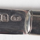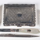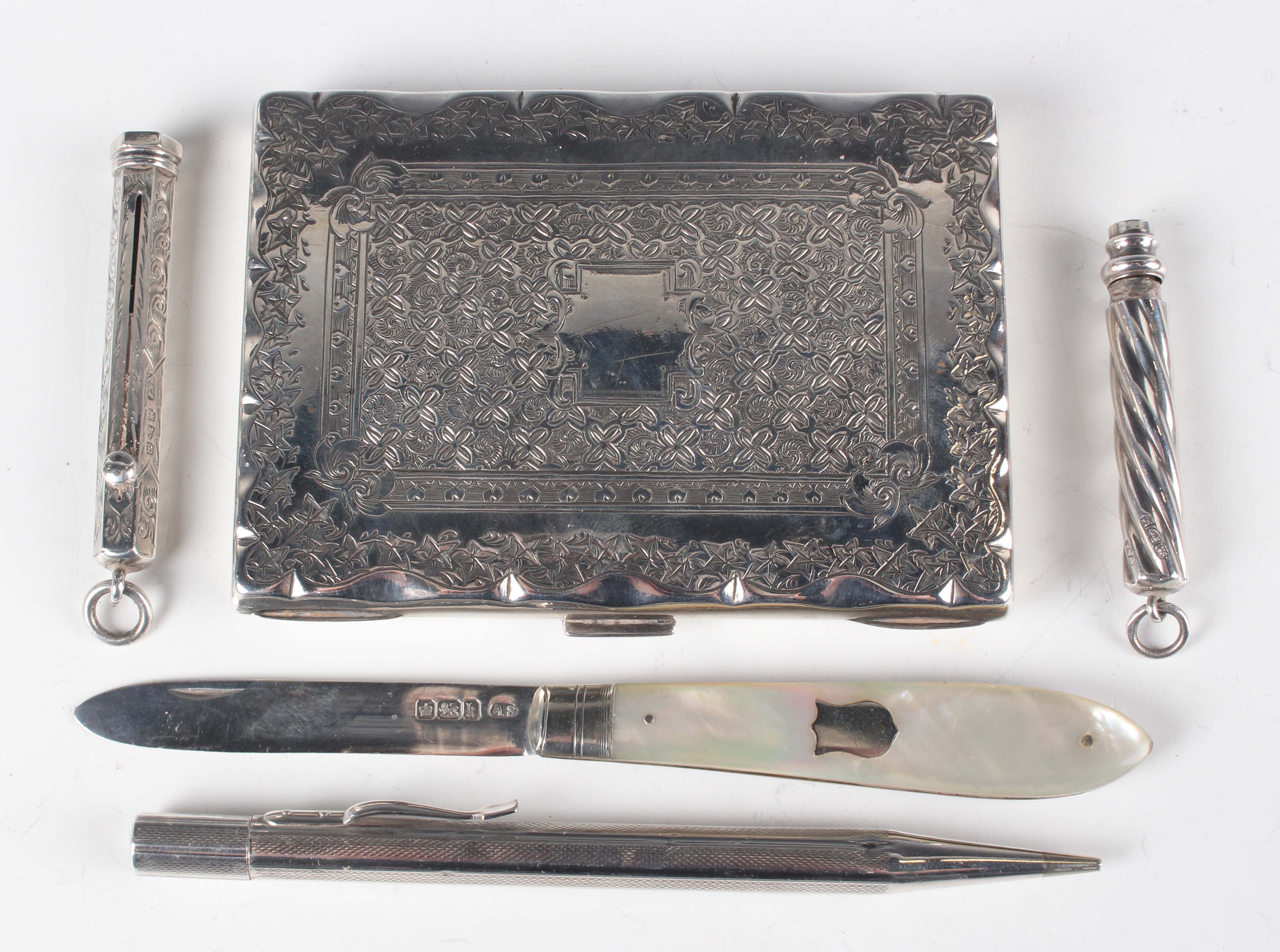 A late Victorian silver rectangular aide-mémoire with engraved decoration, brown leather fitted interior and silver propelling pencil, Birmingham 1898 by Frederick Marson, length 9.8cm, together with a silver bladed mother-of-pearl folding fruit knife, two silver slide-action pencils and a silver propelling pencil.