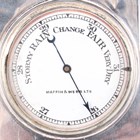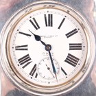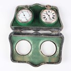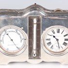 A George V silver mounted desk clock, barometer and mercury thermometer, the central thermometer flanked by a Goliath pocket barometer and a Goliath eight day pocket watch, each with white enamel dials and inscribed 'Mappin & Webb Ltd', the case of shaped rectangular form, monogram and date engraved, with an easel back, Birmingham 1911 by Mappin & Webb Ltd, height 13.5cm, length 21.5cm.