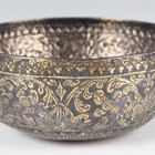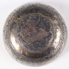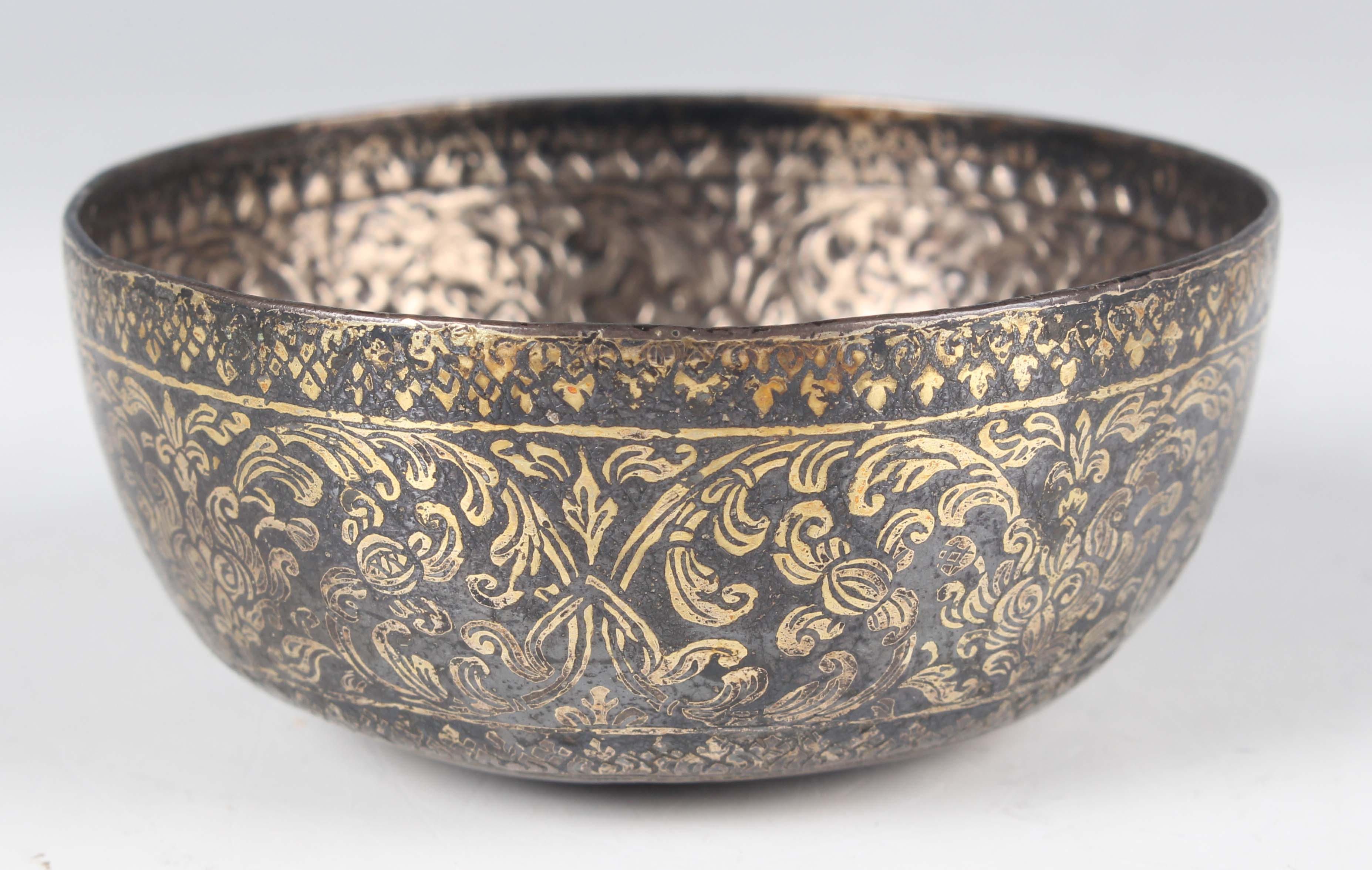 A silver niello and gilt decorated small circular bowl with floral and foliate scroll decoration, probably Persian, weight approx 34.3g, diameter 6.9cm.