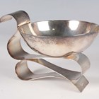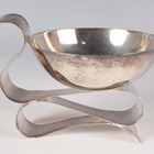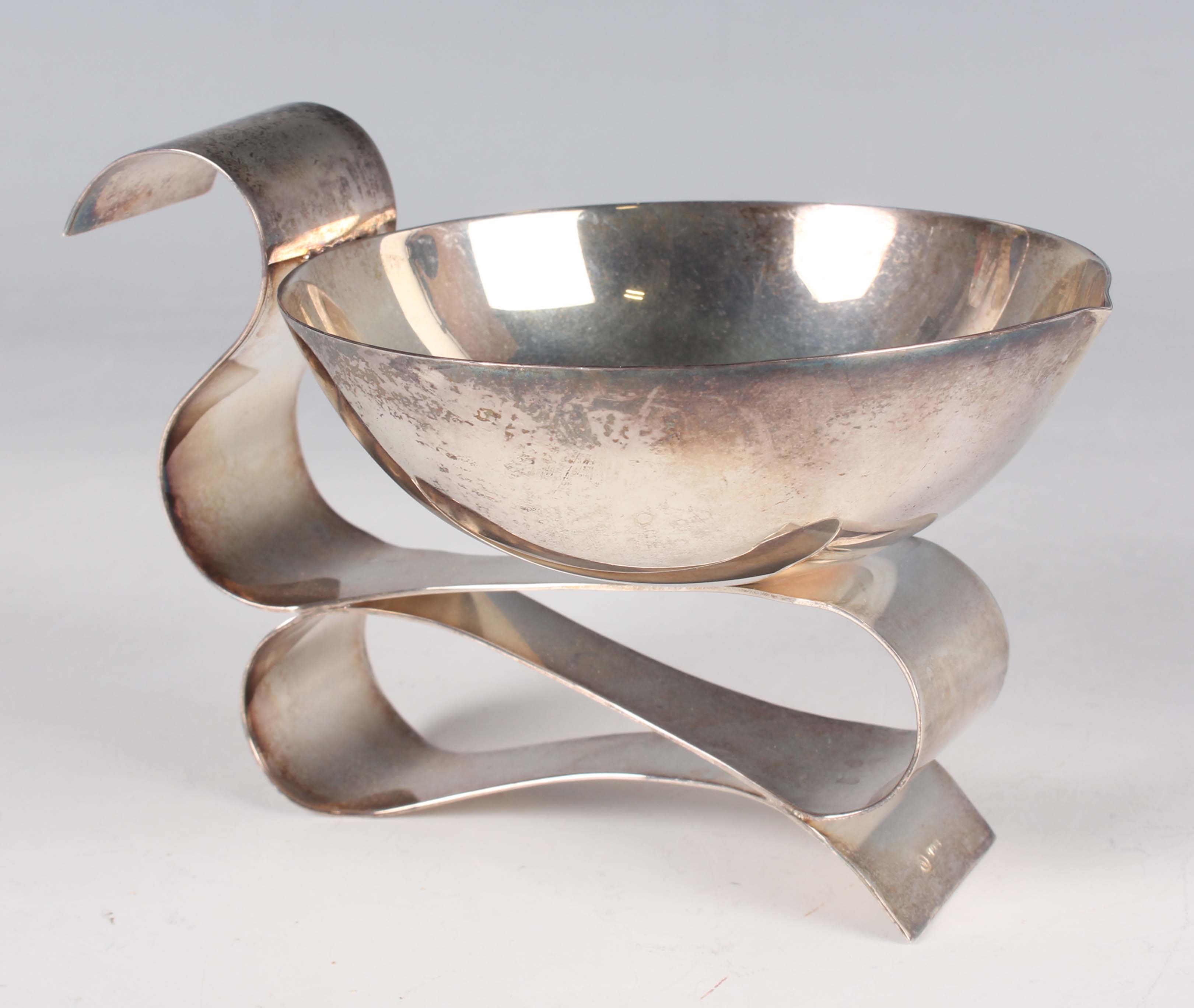 A silver sauceboat, the bowl of circular form, raised on a stylized folded ribbon effect base forming the handle to one side, detailed '925', weight 126.2g, height 7.1cm.