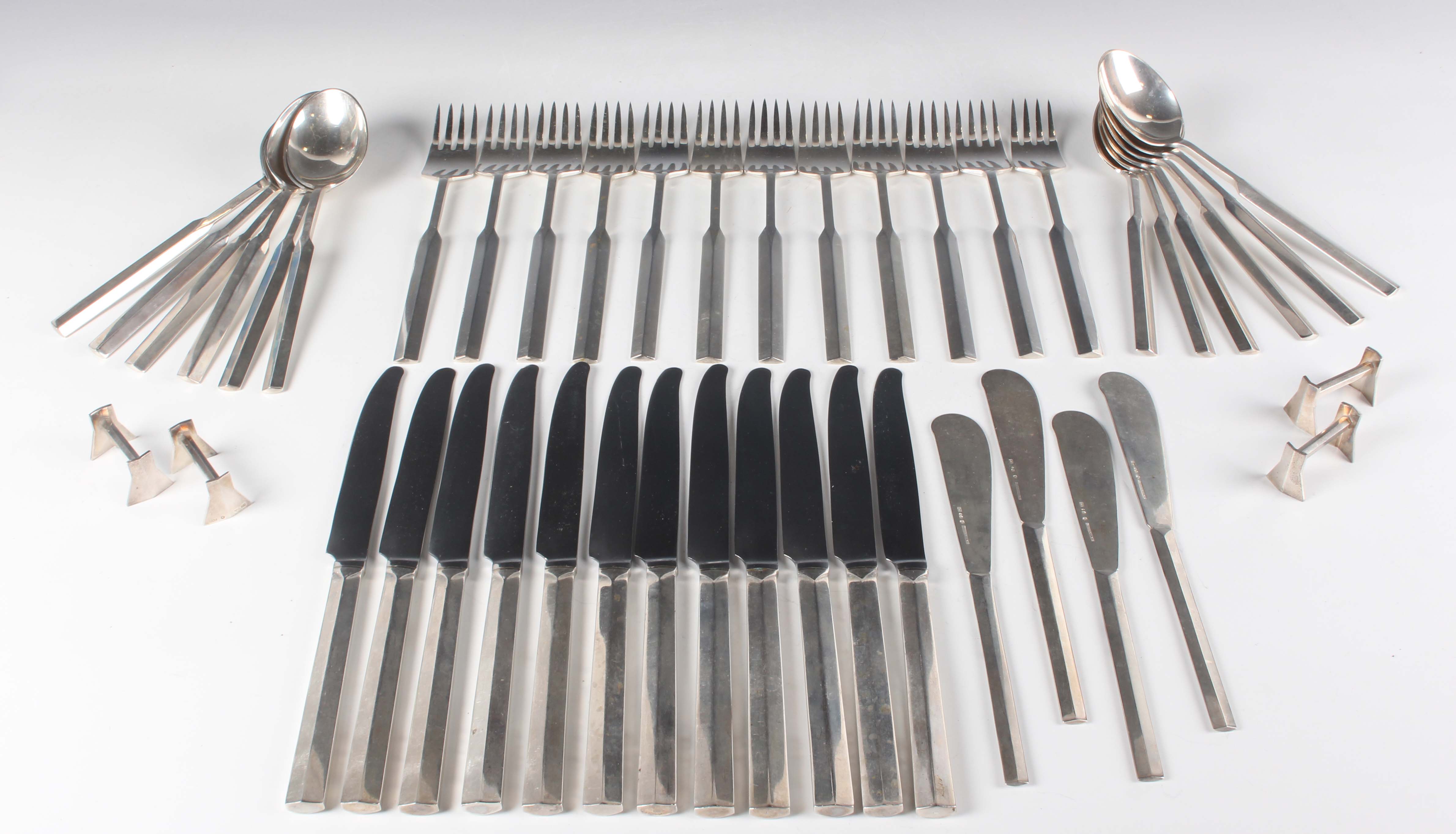 A Swedish part canteen of silver cutlery, comprising twelve table forks and spoons, four butter knives and four knife rests, total weight 1434.8g, and twelve table knives with stainless steel blades, 1965 by Jan Lundgren.