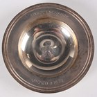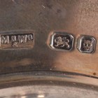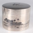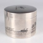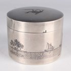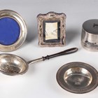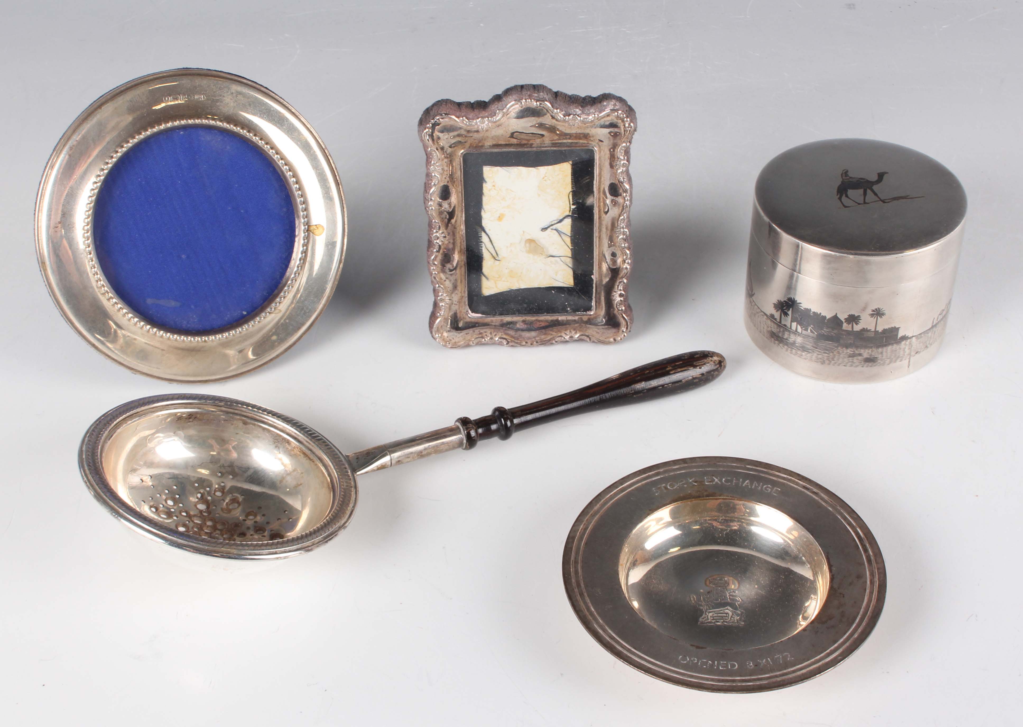 A Persian silver and niello decorated cylindrical box and cover, decorated with camels, boars and palm trees, weight 132.9g, height 4.2cm, and a group of other silver and silver mounted wares, comprising a circular Armada style pin dish, a tea strainer with an ebonized handle, a shaped rectangular photograph frame and a circular photograph frame, weighable items 89.7g.