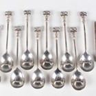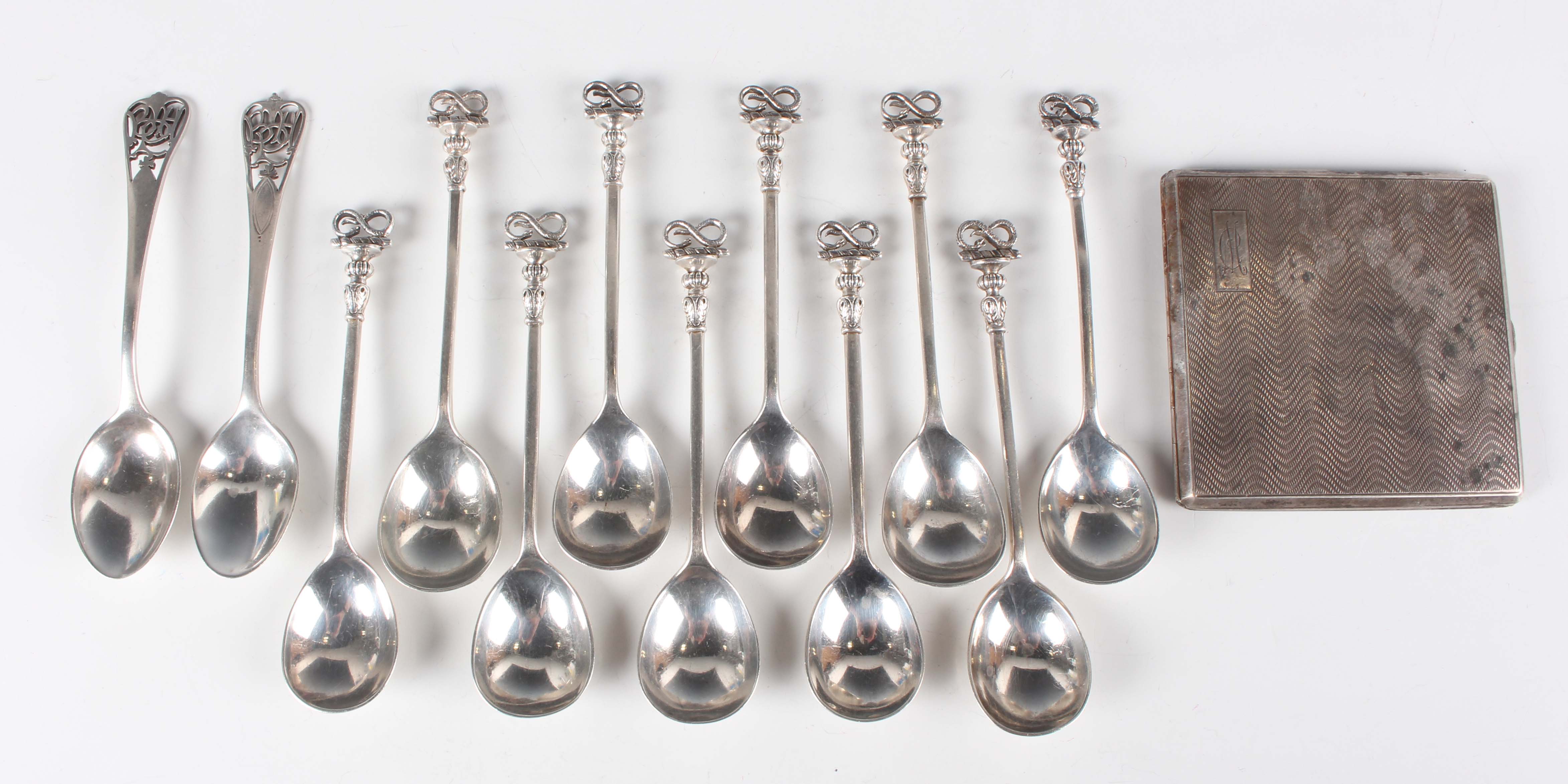 A matched set of ten George V silver teaspoons, each with cast snake terminal, London 1927-1932 by Goldsmiths & Silversmiths Co Ltd and Sheffield 1935 and 1936 by William Hutton & Sons Ltd, together with a silver cigarette case, Birmingham 1928, and two silver teaspoons, pierced with monogram terminals, total weight 341.9g.