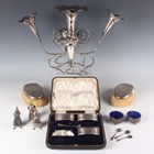 A set of three George V silver salts, each of oval form with ropetwist bands, Sheffield 1915 by James Dixon & Sons Ltd, a pair of silver circular salts with pierced sides, on ball feet, Birmingham 1919, three silver pepper casters and three silver condiment spoons, total weight 219g, together with a pair of silver mounted hairbrushes and a plated epergne of scroll wirework form, fitted with five graduated trumpet vases.
