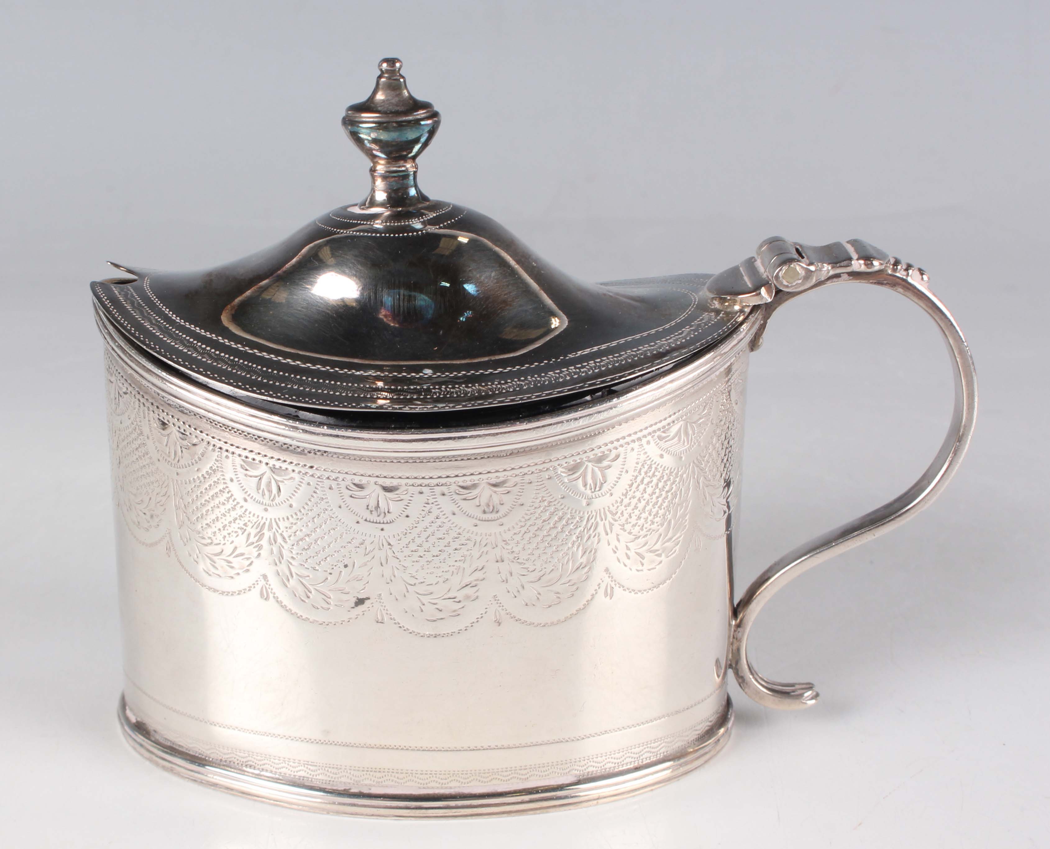 A George III silver oval mustard with engraved decoration, London 1798 by Orlando Jackson, weight 84.7g, height 8cm.
