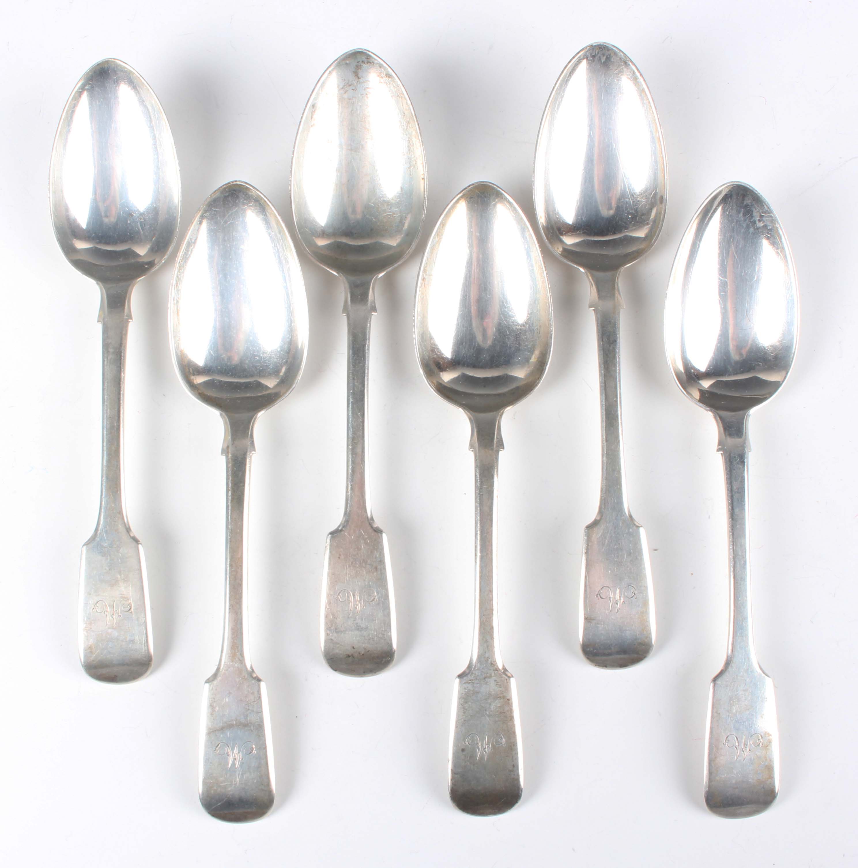 A set of six early Victorian silver Fiddle pattern dessert spoons, London 1847 by Samuel Hayne & Dudley Cater, weight 279.9g, length 17.9cm.