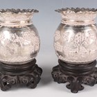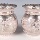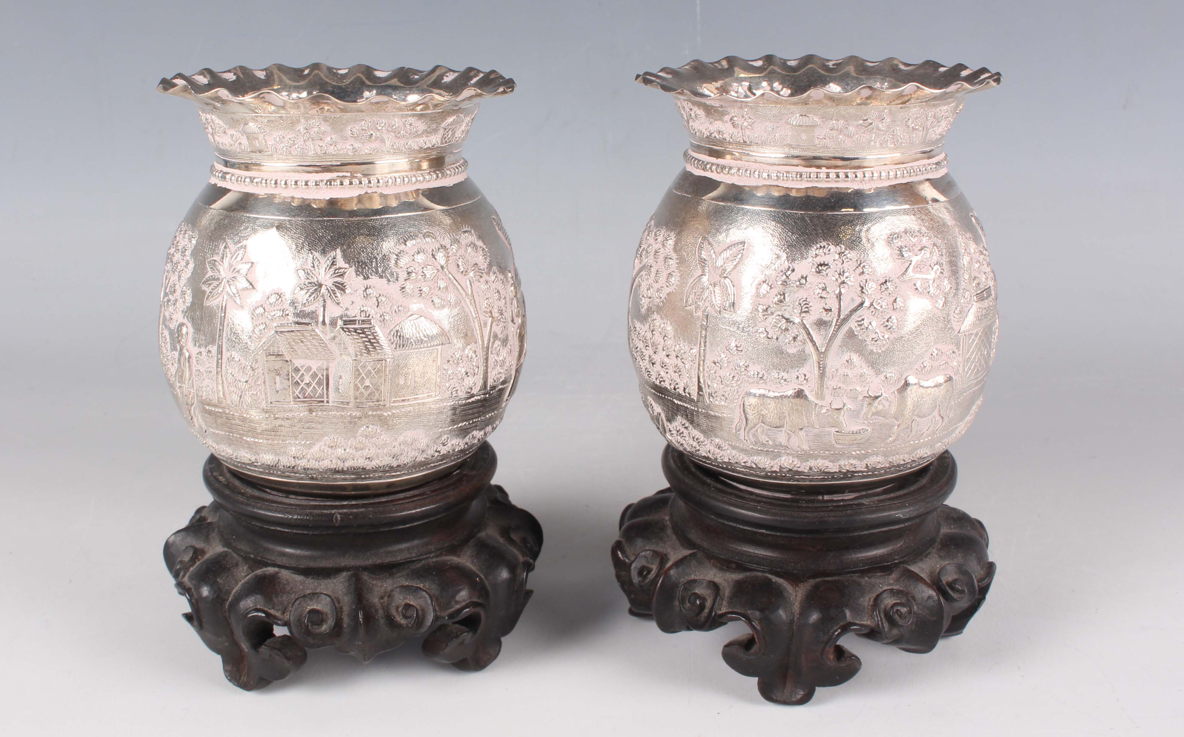 A pair of Indian colonial white metal vases, each of ovoid form with flared and frilled rims, typically decorated with rural scenes of figures, huts and trees, by Dass & Dutt of Calcutta, total weight 263.7g, height 9cm, with a pair of carved wood stands.