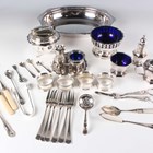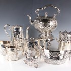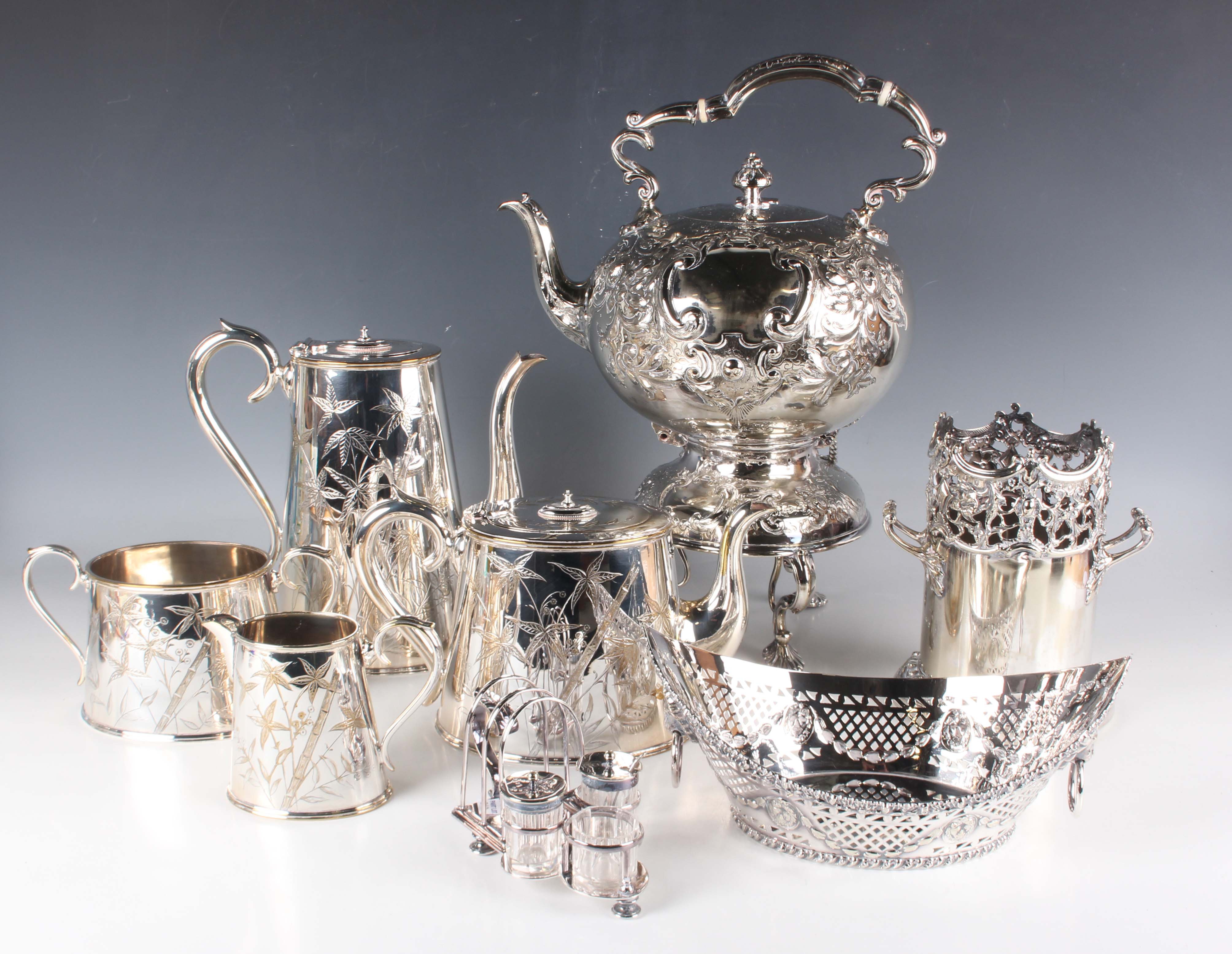 A group of plated items, including a spirit kettle-on-stand (faults), a syphon stand, a four-piece tea set, a three-section toast rack and stand, fitted with a three-piece condiment set, a pair of grape shears and a bread basket.