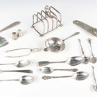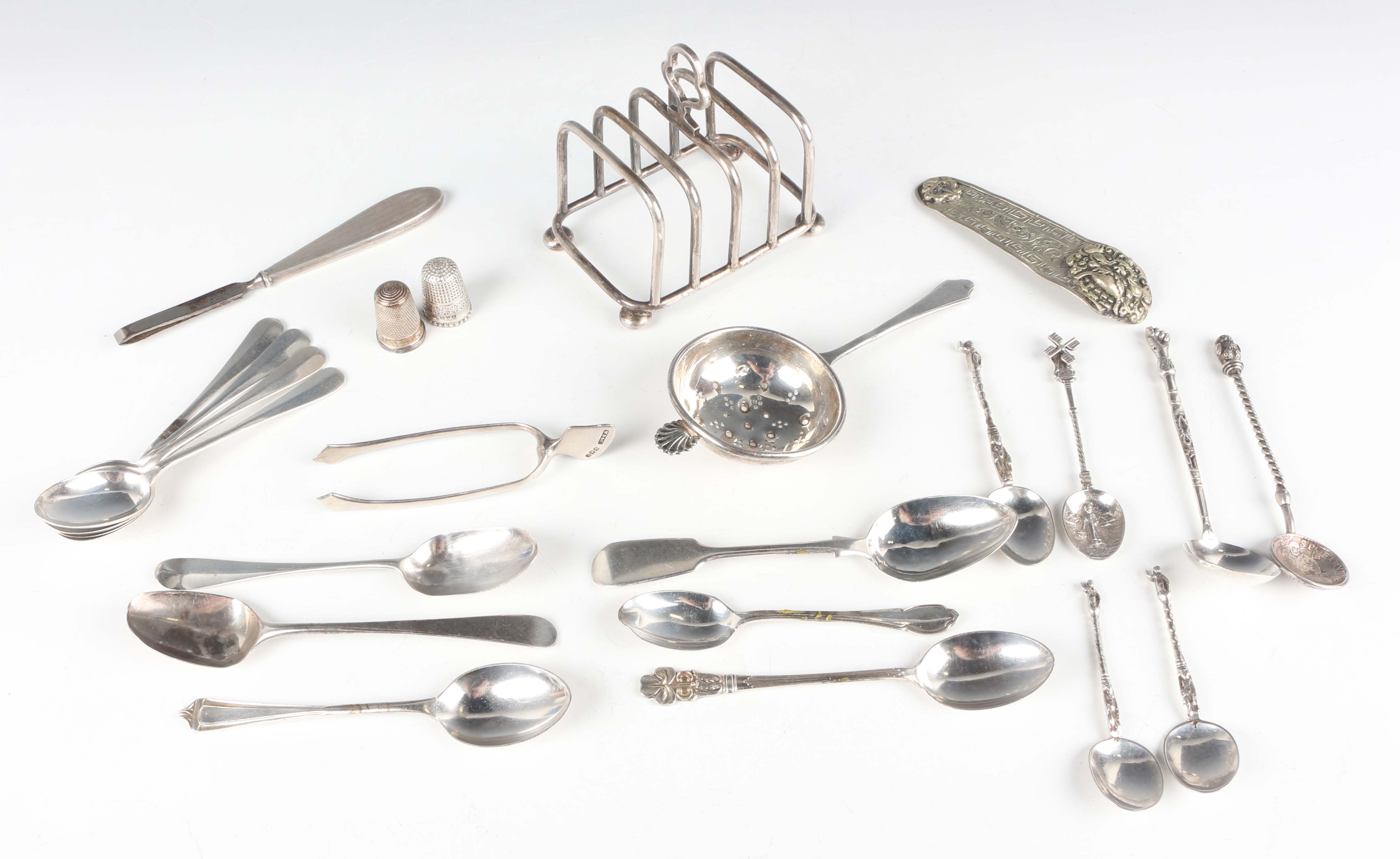 A George V silver four-division toast rack on bun feet, Birmingham 1913 by Mappin & Webb Ltd, length 9cm, and a small group of other silver, including a pair of Scottish wishbone sugar tongs, Edinburgh 1938 by William Dunningham & Co, length 9.7cm, and a tea strainer, total weight 272g, together with a small group of European silver spoons, total weight 61.3g.