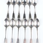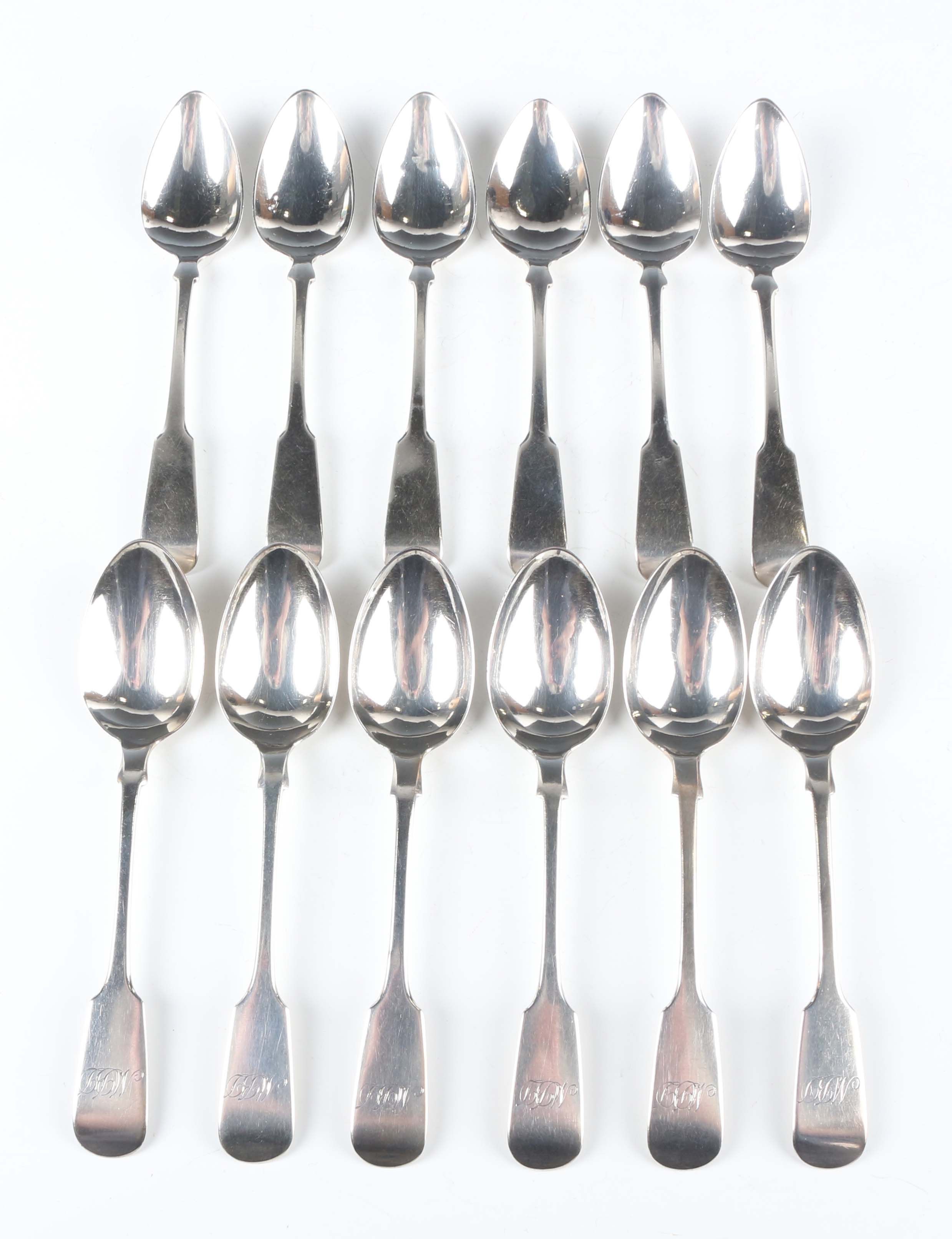 A set of six George III Scottish silver Fiddle pattern teaspoons, Glasgow 1819 by David McDonald, length 13.3cm, and a set of six Victorian Scottish silver Fiddle pattern teaspoons, Edinburgh 1847 by Thomas Cooper, length 14.3cm, total weight 170.4g.