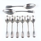 A pair of William IV silver Fiddle pattern tablespoons, London 1834 by William Eaton, length 22.5cm, and a set of six silver Fiddle pattern teaspoons, London 1860 by Henry Holland, total weight 287.5g.