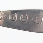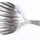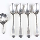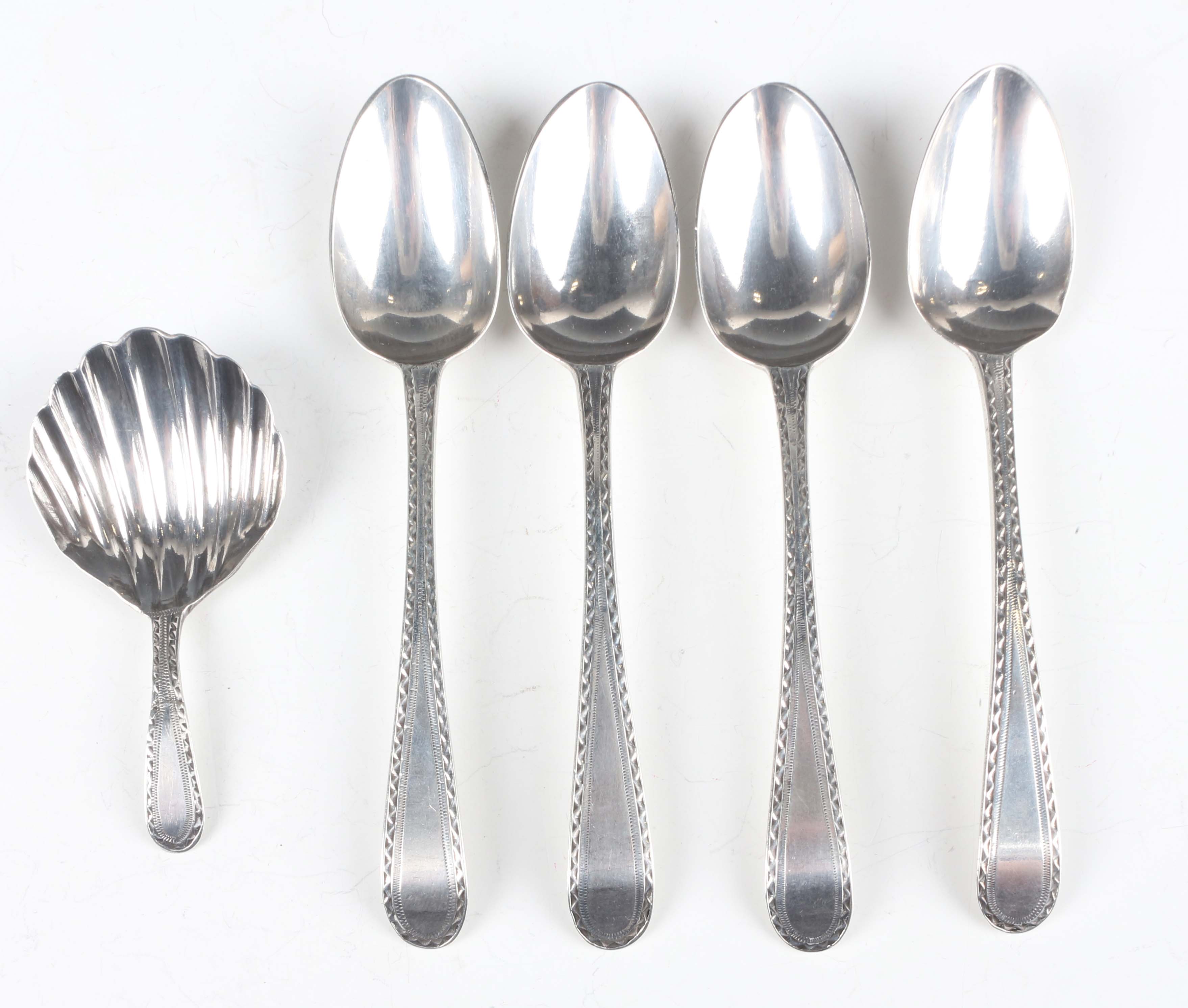 A George III silver caddy spoon with scallop shell bowl and bright-cut engraved handle, London 1795, length 7.2cm, and a set of four silver Old English bright-cut engraved pattern teaspoons, London, no date letter, by Hester Bateman, total weight 59.6g.