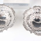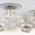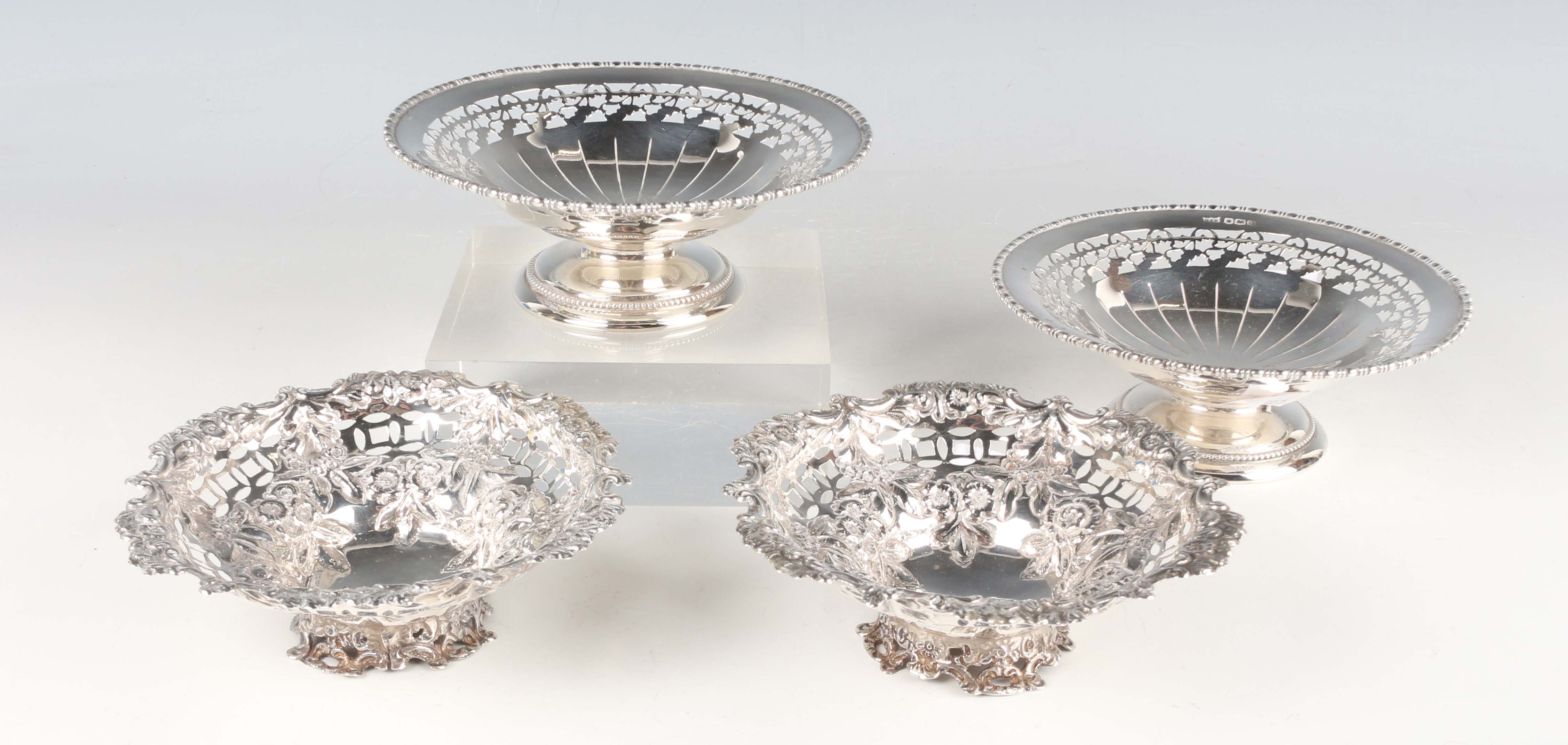 A pair of late Victorian silver circular bonbon tazzas, each pierced and embossed with flowers and leaves, on a similarly decorated circular foot, Birmingham 1896 by Nathan & Hayes, diameter 11.5cm, and a pair of silver circular bonbon tazzas with pierced sides and beaded rims, on a similarly decorated circular foot, Sheffield 1931 by Mappin & Webb Ltd, diameter 12.5cm, total weight 276.9g.