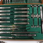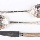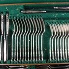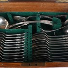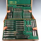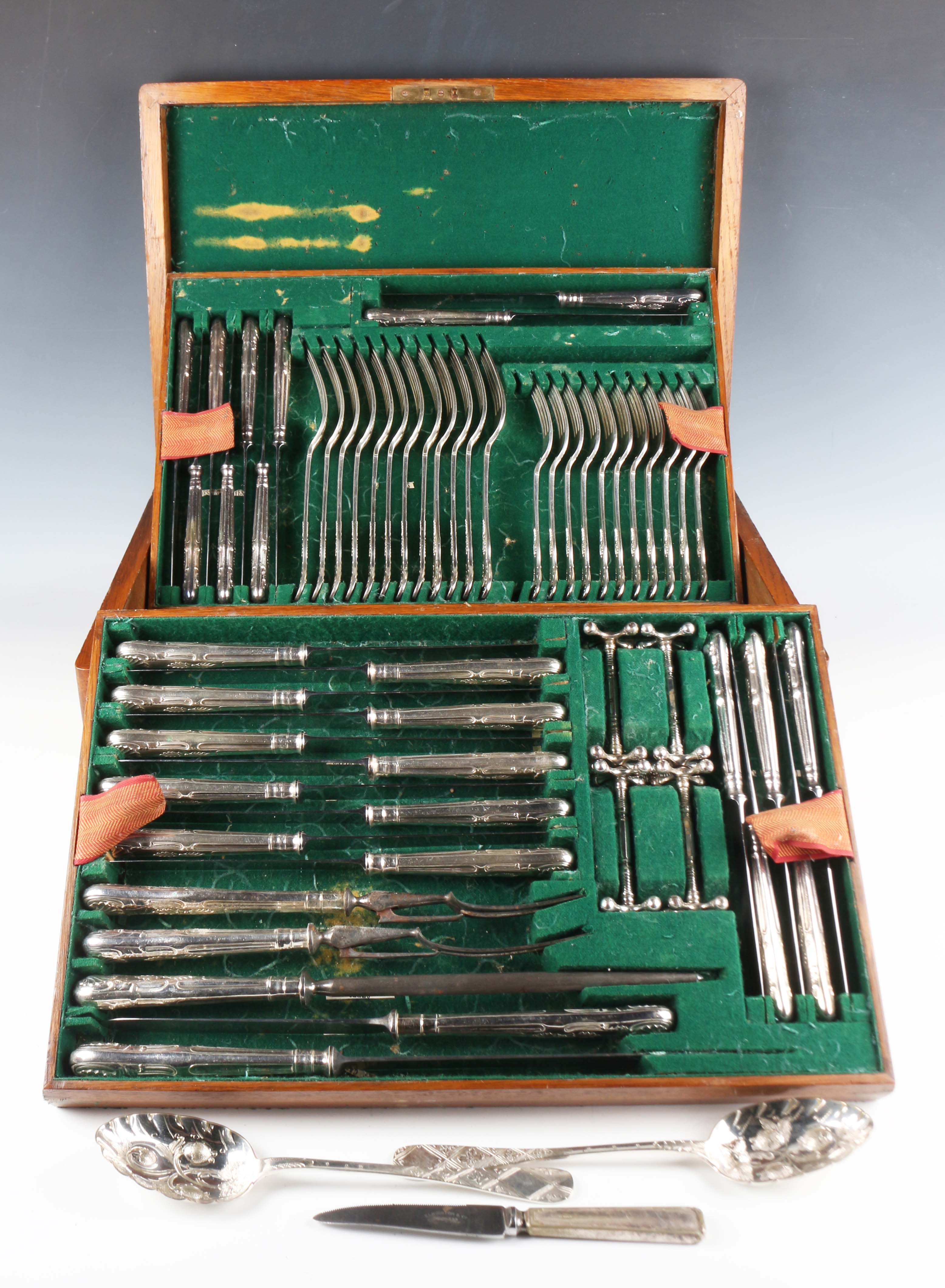 A part canteen of plated King's pattern cutlery, comprising twelve tablespoons, forks and knives, eleven dessert forks, twelve dessert knives and spoons, soup ladle, gravy spoon, two sauce ladles, four knife rests and five-piece carving set, within an oak canteen box, and a pair of plated berry spoons.