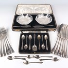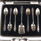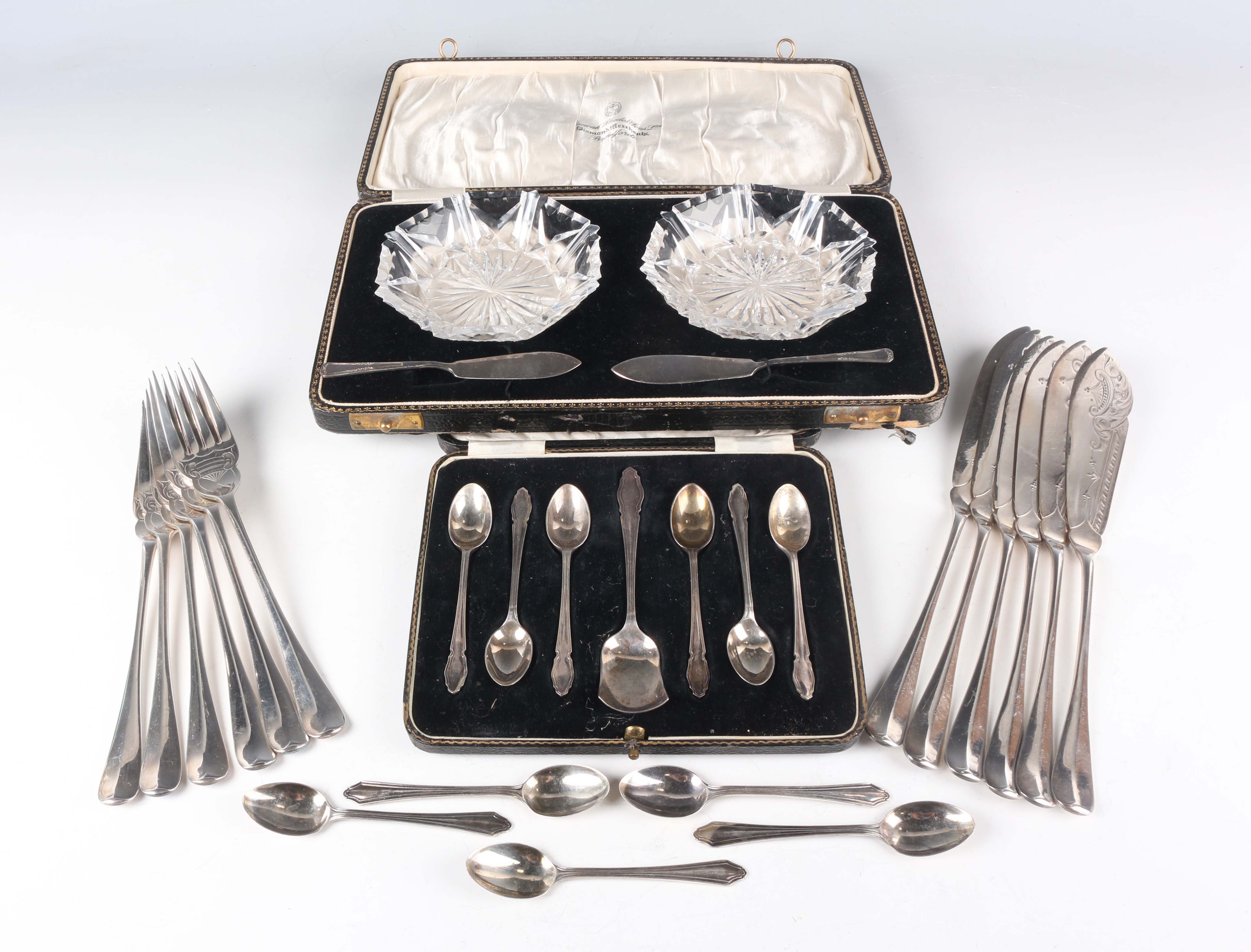 A set of six George VI silver coffee spoons and matching sugar shovel, Sheffield 1939, cased, five silver coffee spoons, Birmingham 1933, and a pair of silver butter knives, Sheffield 1961, total weight 121.5g, together with a pair of octagonal cut glass butter dishes, cased, and a set of six plated fish knives and forks.