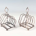 A pair of silver four-division toastracks, raised on faceted feet, Sheffield 1899 and 1902 by Martin Hall & Co, total weight 222.4g, length 7cm.