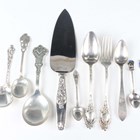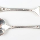 A Continental .830 silver fork and spoon, each with pierced and cast floral and scroll handle, a small group of other .830 silver spoons, total weight 205.2g, a .830 silver handled cake slice and a small group of other silver spoons, total weight 44.6g.