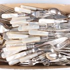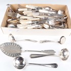 A group of plated items, including a six-division toastrack, a sugar caster and mother-of-pearl handled knives and forks, together with a silver stub candlestick (damaged).