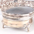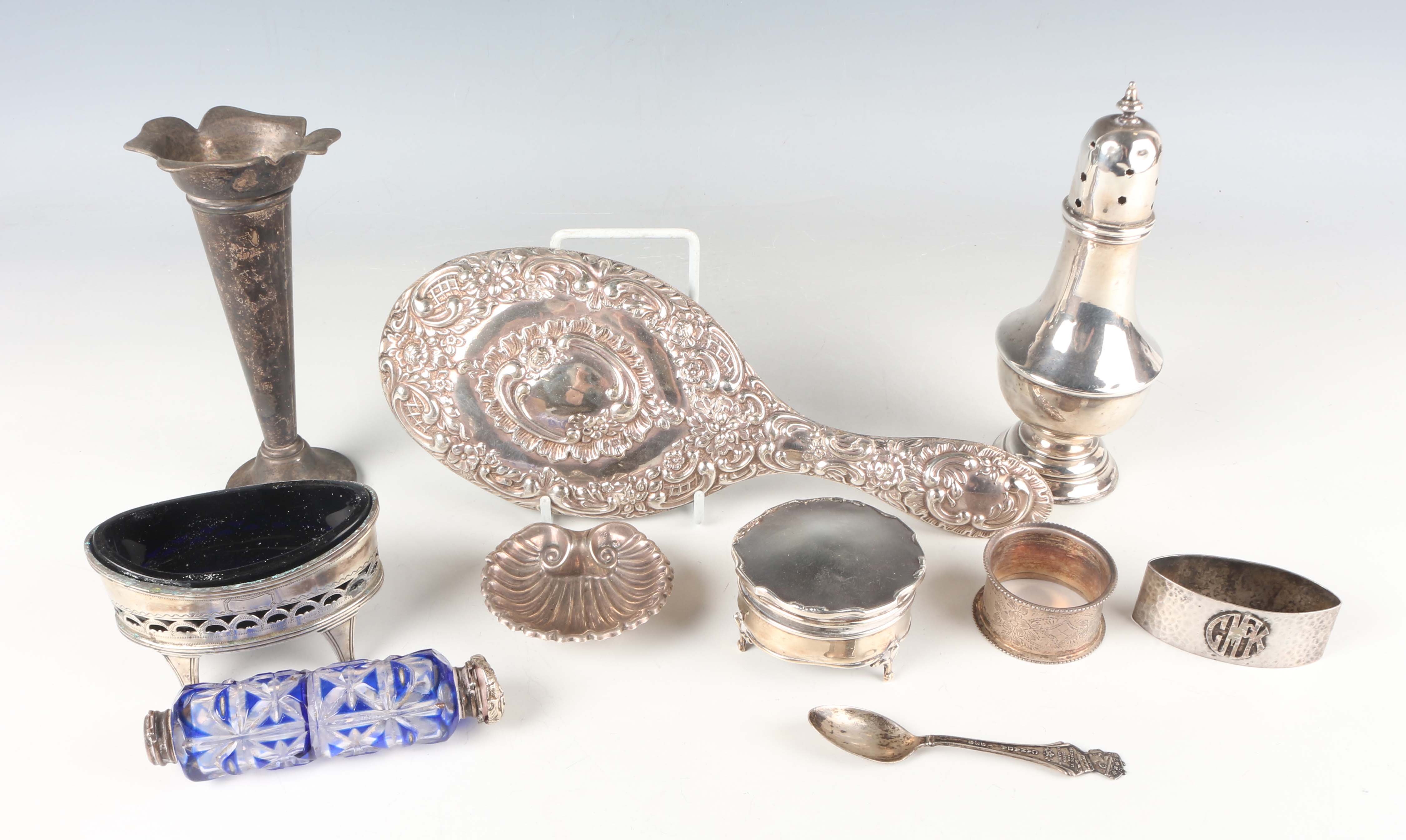 A small group of assorted silver, including a sugar caster, Birmingham 1922 by Marson & Jones, height 16cm, a jewellery box, Birmingham 1922, diameter 6.3cm, a silver backed hand mirror and a napkin ring, weighable items 180g.
