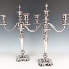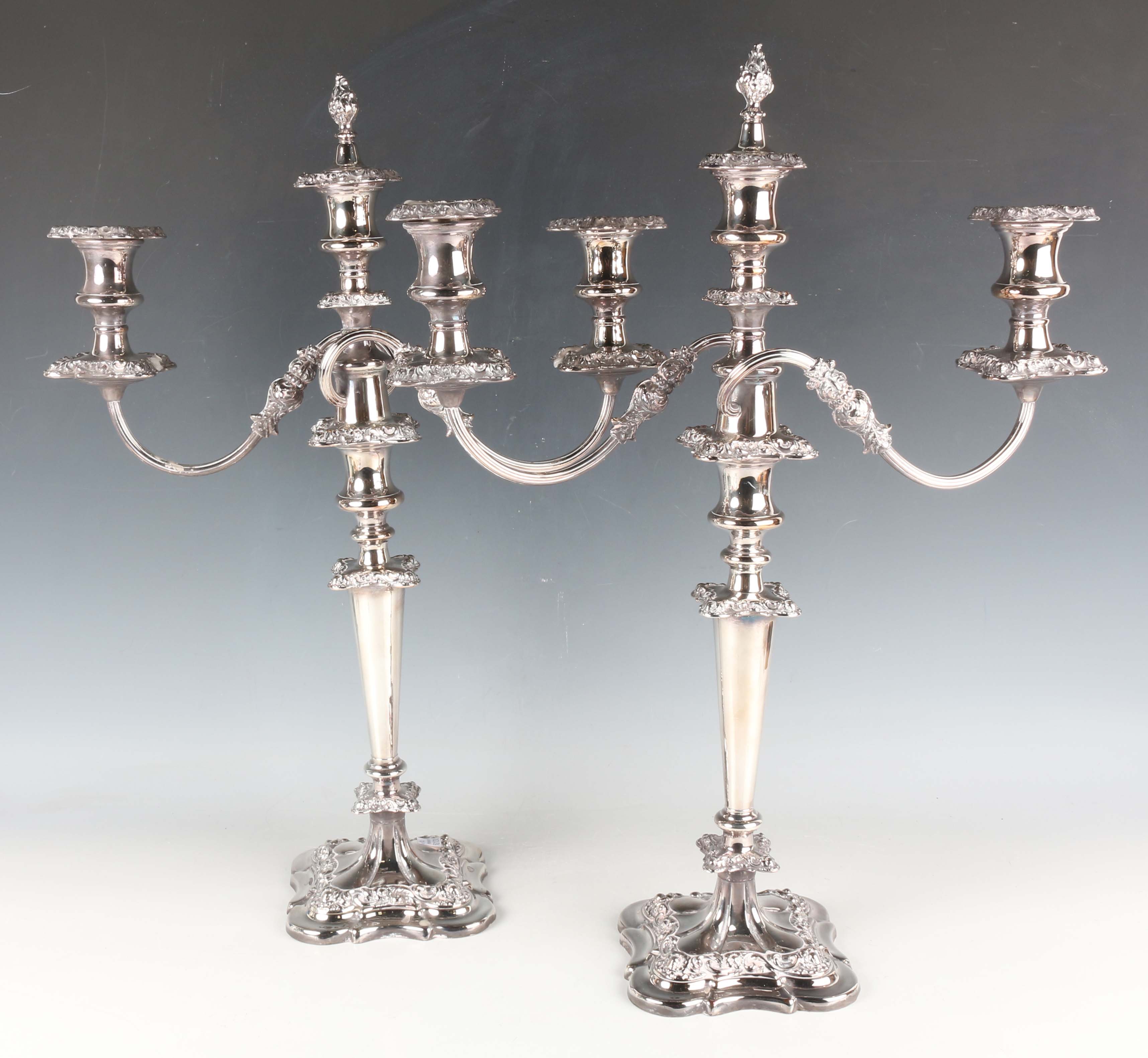 A pair of early 20th century plated twin-scroll-branch three-light candelabra, each urn shaped sconce with detachable square cast foliate nozzle above reeded and foliate scroll branches, on a tapering cylindrical stem and similarly cast square base, height 52.5cm.