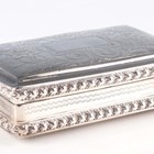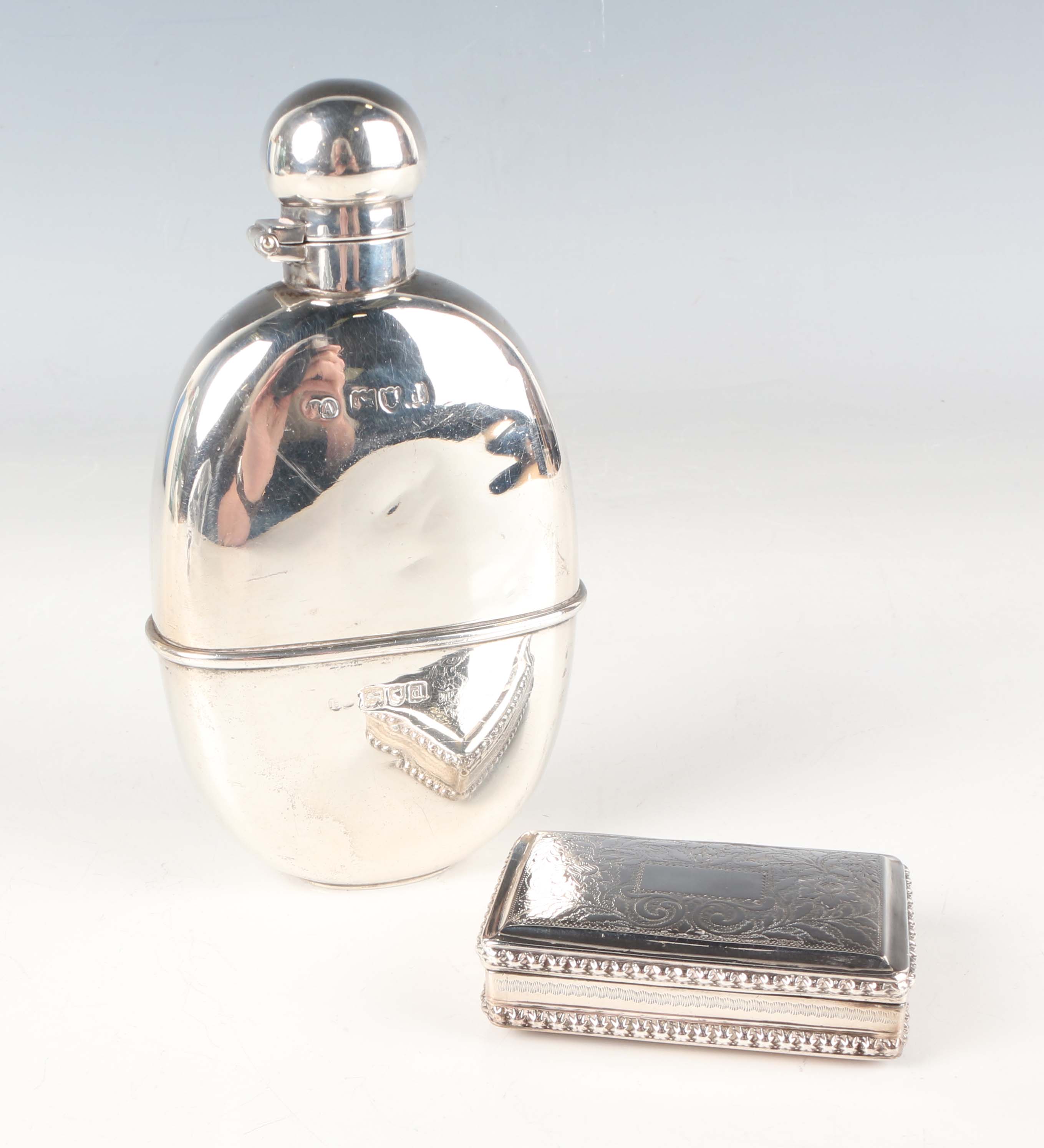 A late Victorian silver hip flask with rotating hinged lid and detachable cup, London 1899 by Atkin Brothers, height 13.5cm, and a silver rectangular snuff box with engraved decoration and beaded sides, Birmingham 1823 by Thomas Newbold, length 6.5cm, total weight 215g.