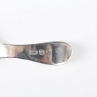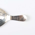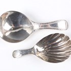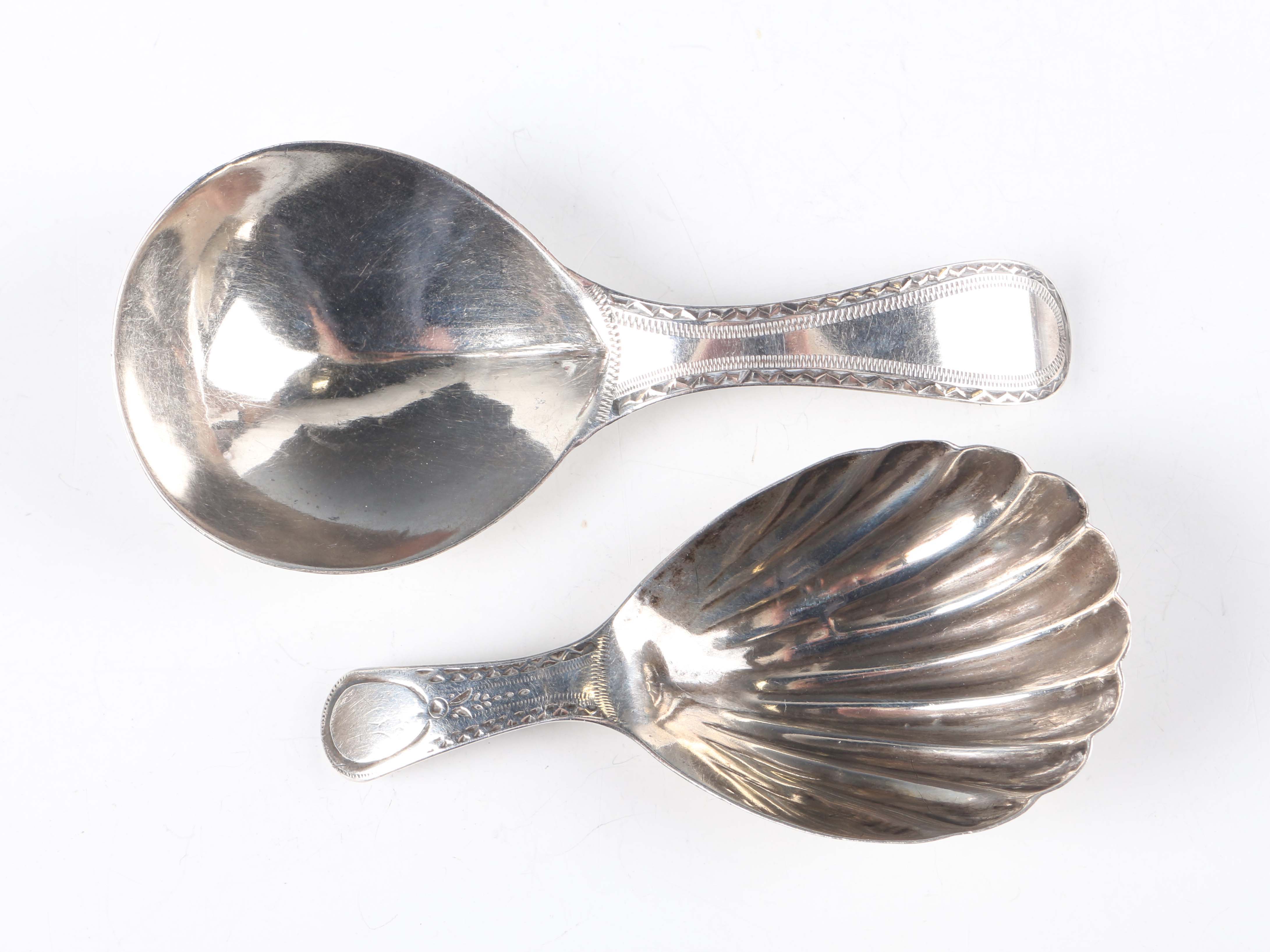 A George III silver caddy spoon with scallop shell bowl and engraved handle, London 1794 by Thomas Morley, length 7cm, and another silver caddy spoon with bright cut engraved decoration, London 1790 by Hester Bateman, length 8.7cm, total weight 16.1g.