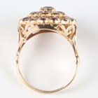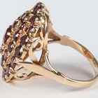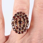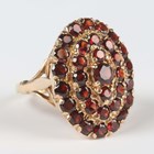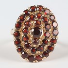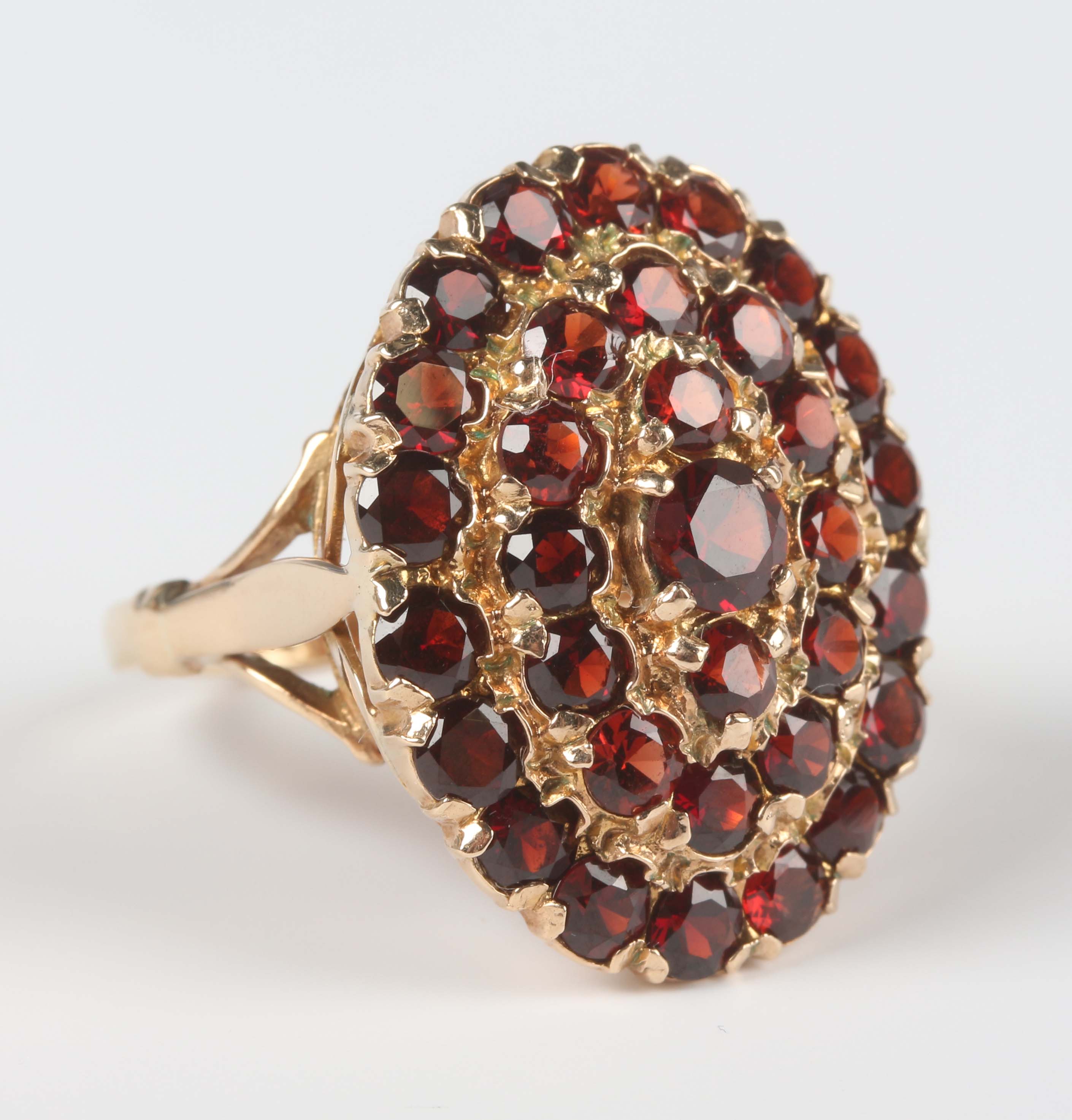 A 9ct gold and garnet oval cluster ring, mounted with circular cut garnets, weight 5.9g, ring size approx P.