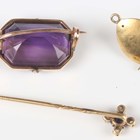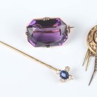 A gold stickpin, claw set with a central cushion shaped sapphire within a surround of four cushion shaped diamonds, a gold and amethyst single stone brooch, total weight 9.9g, and a Victorian drop shaped pendant with tassels.